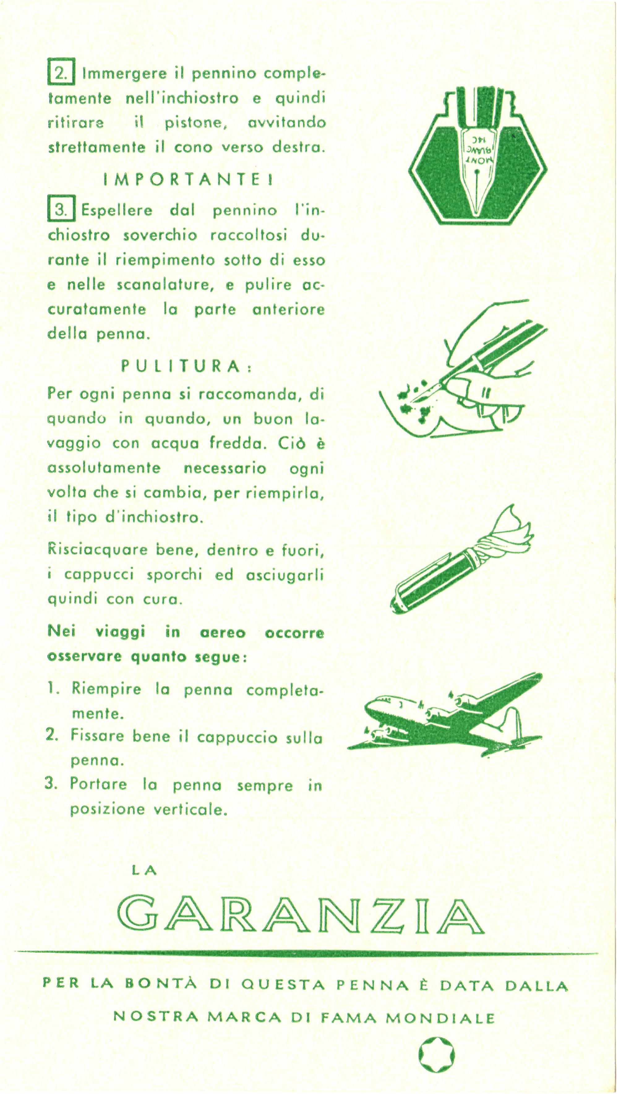 Scanning of a Montblanc instruction sheet from '50s. For a Montblanc 25x model. Rear. On the other side of File:195x-Montblanc-25x-InstrWarr-IT-Front.jpg. Retouched by the author for a better sharpness. Contributed by Paolo, http://www.zona900.it, (utente forum fountainpen.it sanpei). From an original package.