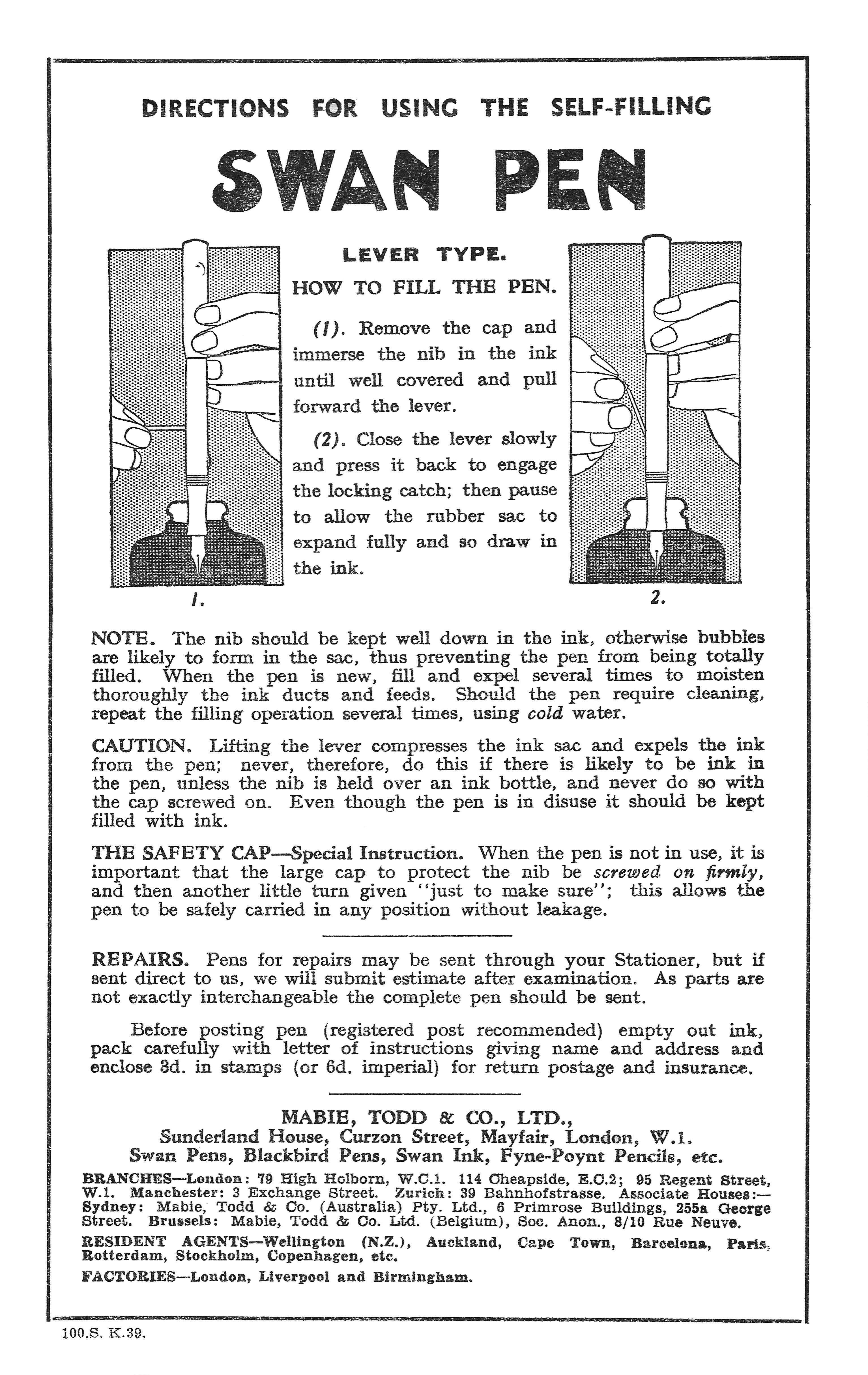 Scanning of a Swan instruction sheet from '10s. For a Swan SF 1 model. Mention as address: "Sunderland House, Curzon Street, Myfair, London, W.1". Front. Before 1919 when headquarters moved in Oxford Street. On the other side of File:192x-Swan-Lever-Instro-Rear.jpg. Retouched by the author for a better sharpness. From an original package.