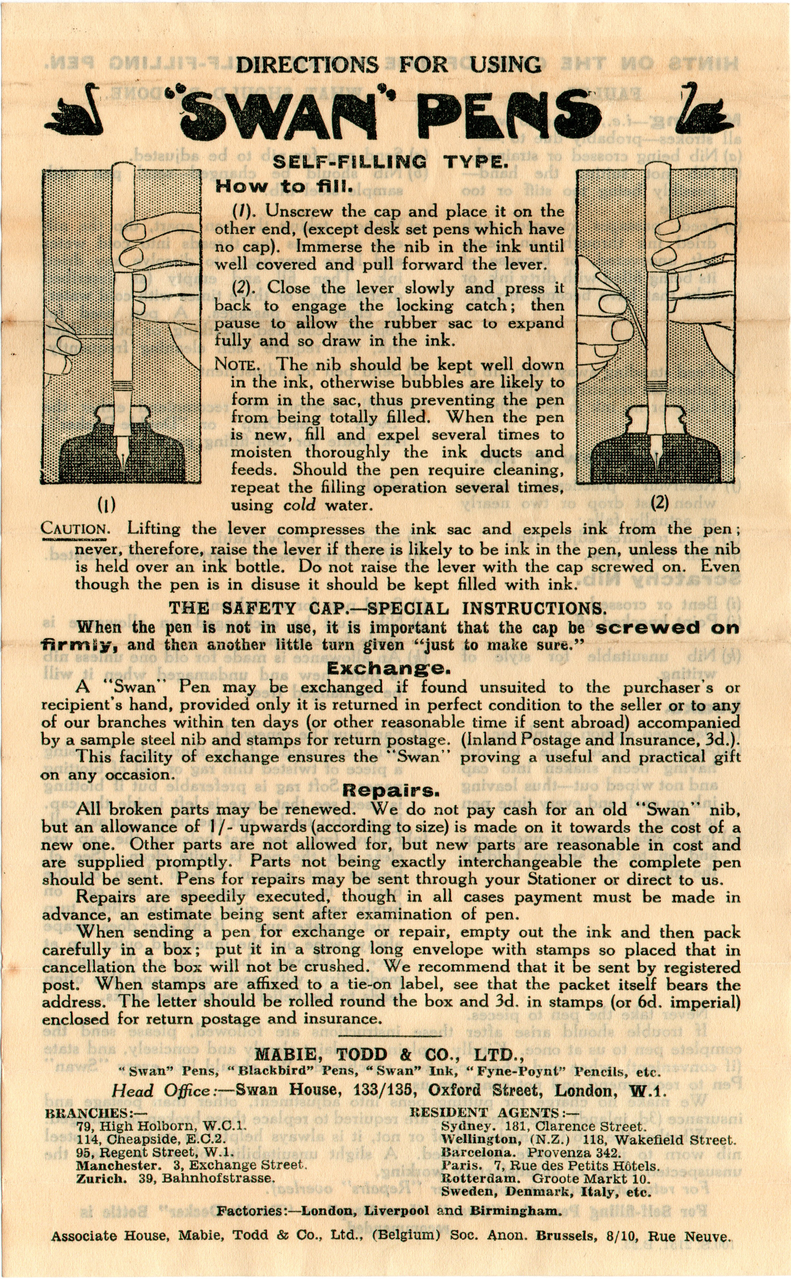 Scansione di un foglietto di istruzioni Swan degli anni '20. Relativo ad un modello Swan SF 2. Cita come indirizzo: "Swan House, 133/135 Oxford Street, London, W.1". Fronte. Posteriore al 1919, quando la sede venne portata in Oxford Street, e precedente il 1936 anno in cui la sede venne spostata in Sutherland Street. Sull'altro lato di File:192x-Swan-SelfFilling-Instro-Retro.jpg. Ritoccata dall'autore per una migliore nitidezza. Contributo di Luca (utente forum lucawm). Da una confezione originale.
