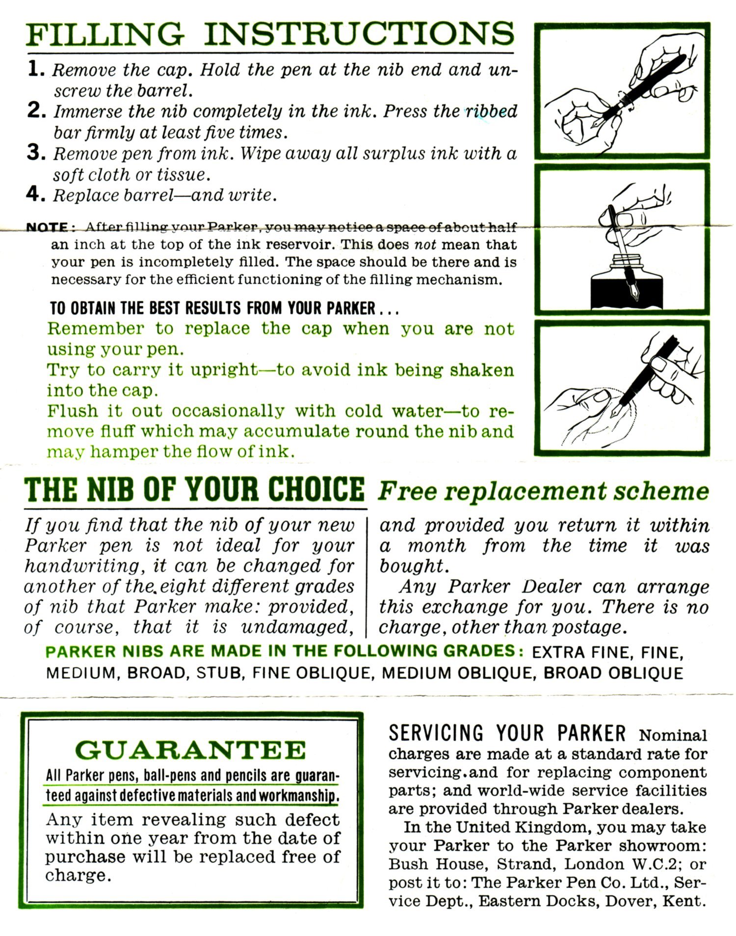 Scansione di un foglietto di istruzioni Parker degli anni '60. Relativo ad un modello Parker Slimfold. Fronte. Sull'altro lato di File:Parker-Slimfold-Istro-Back.jpg. Ritoccata dall'autore per una migliore nitidezza. Contributo di Walter (utente forum fountainpen.it wallygator). Da una confezione originale.