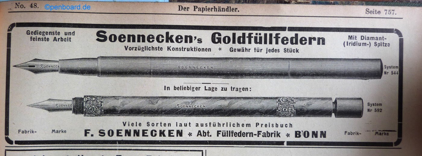 Scansione di una pubblicità Soennecken datata 1909-11-27. Pubblicazione su: Der Papierhändler - Fachblatt Schreibwaren für Papier u. Büro-Bedarf, vol. 48, pag. 757. Contributo di Tom Westerich, https://www.penboard.de. Data ottenuta da quella di pubblicazione del volume da cui la pagina è estratta. Mese e giorno determinati dal numero della rivista. Pubblicità per due stilografiche, una Soennecken 544 e una Soennecken 592.