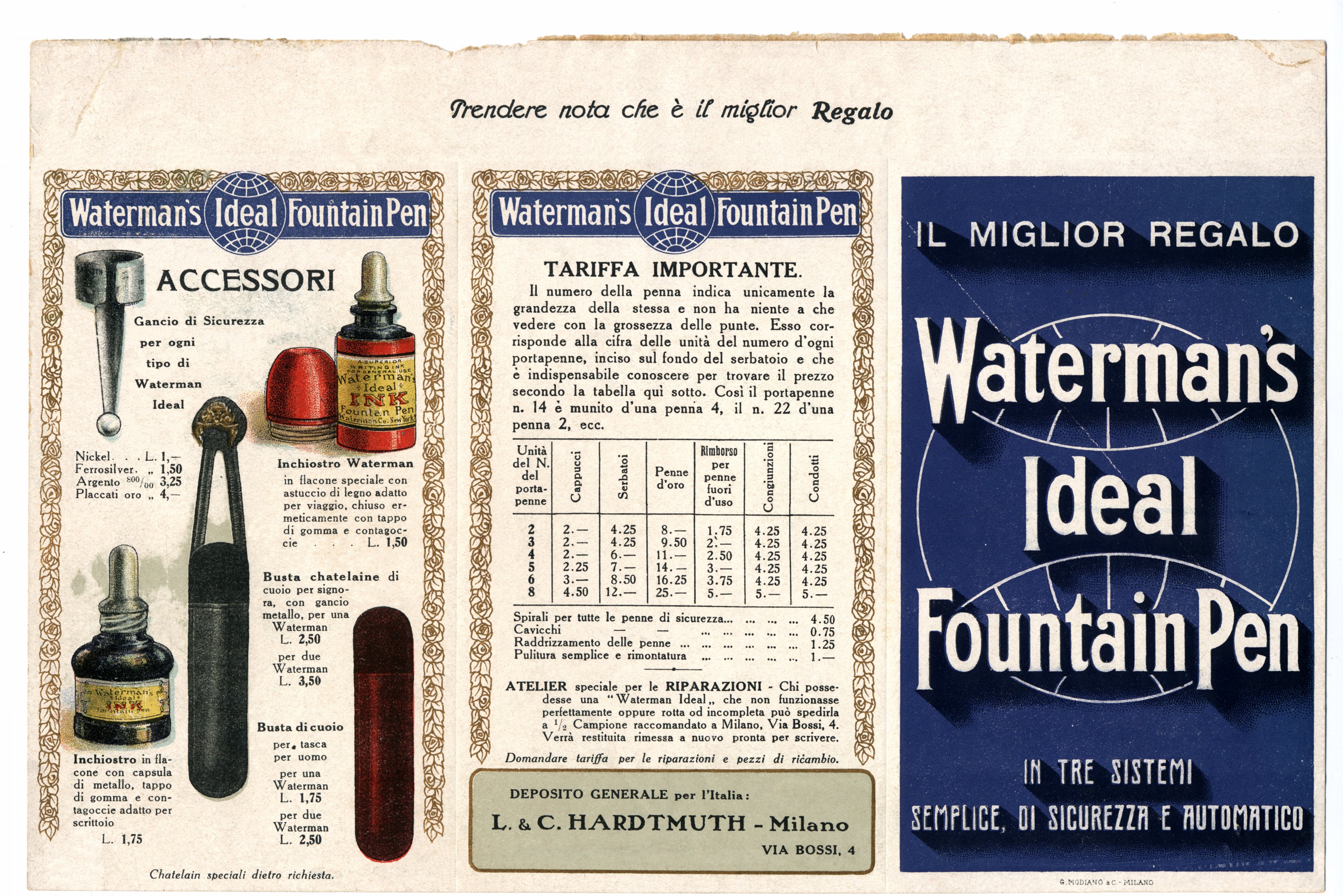 Scanning of a booklet from Waterman dated 1913. Retouched by the author for a better sharpness. Guess date, but earlier than 1914, when Cav. Drisaldi became the Waterman agent in Italy. External side. Advertising for model and other products of that time and specifically for the spare parts. On the other side of File:191x-Waterman-Brochure-Blue-p02.jpg.