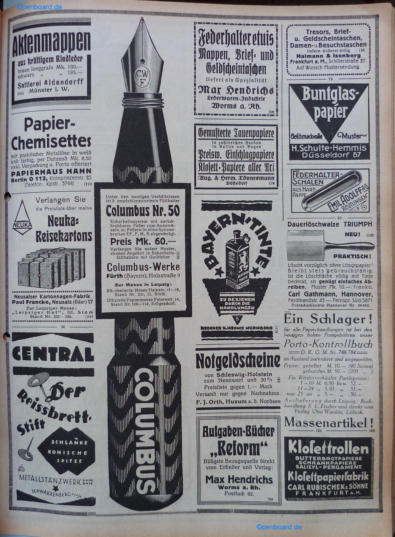 Scansione di una pubblicità datata 1922. Pubblicazione su: Der Papierhändler - Fachblatt Schreibwaren für Papier u. Büro-Bedarf. Contributo di Tom Westerich, https://www.penboard.de. Data visibile direttamente. Pagina di pubblicità varie per articoli di cancelleria con un riquadro concernente penne stilografiche, una pubblicità Columbus-Werke che mostra il modello Columbus Nr. 50.