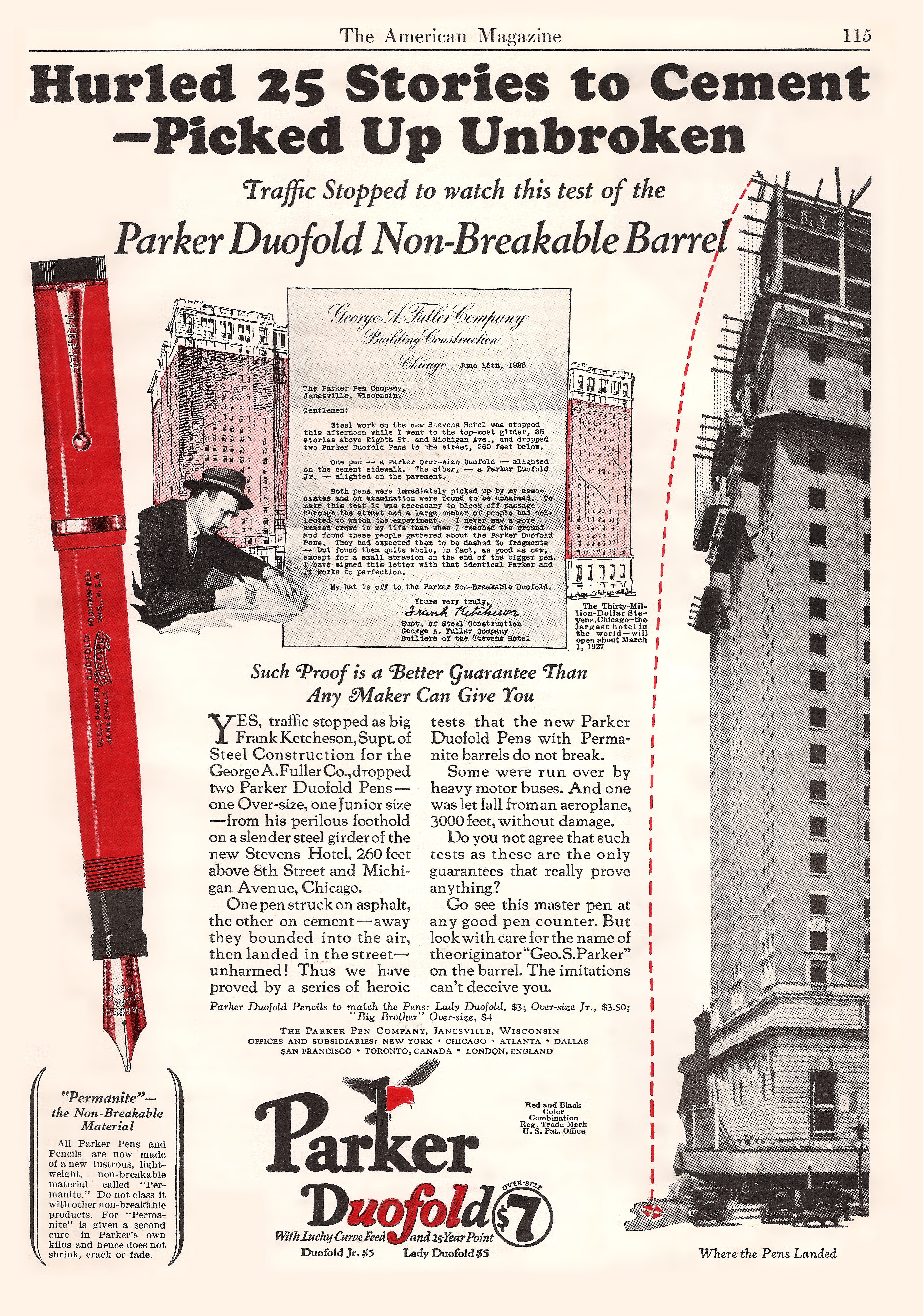 Scansione di una pubblicità Parker datata 1926-11. Pubblicazione su: The American Magazine. Ritoccata dall'autore per una migliore nitidezza. Data ottenuta dal reperimento della pagina su Google Books. Relativa alla pubblicazione dello stesso testo su Boy's Live di questo mese. Pubblicizza il modello Duofold per l'infrangibilità della nuova costruzione in Permanite.
