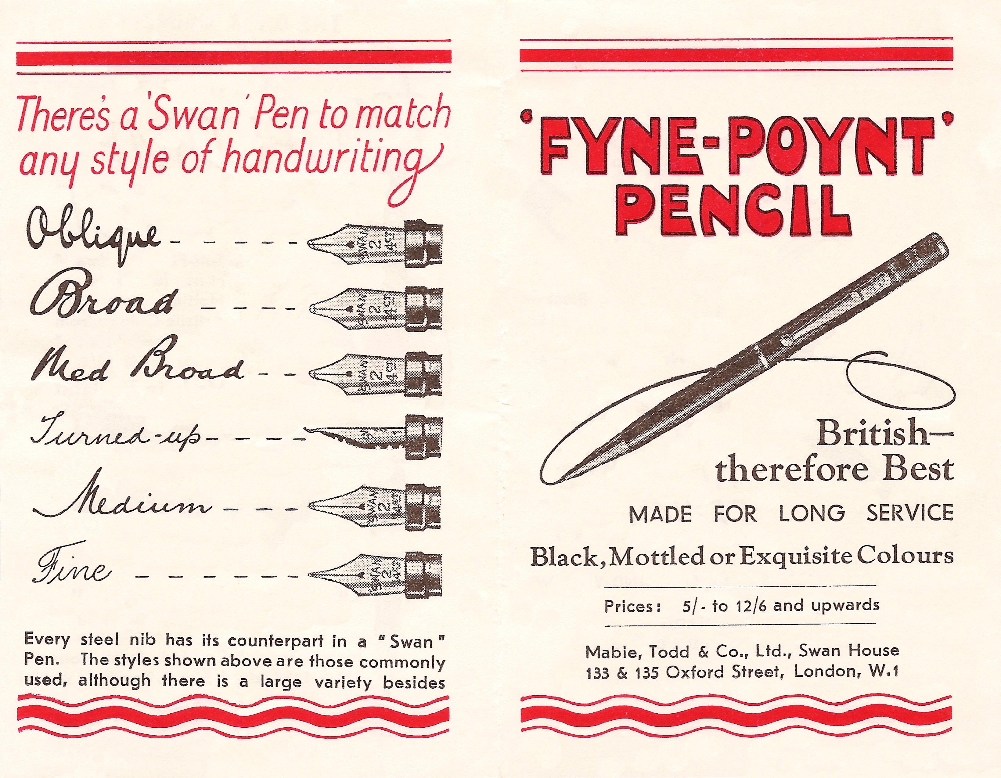 Scansione di un libretto Swan datata 1925. Indica come indirizzo: "Swan House, 133 & 135, Oxford Street, London". Ritoccata dall'autore per una migliore nitidezza. Data indicativa, sta per gli anni '20. Pubblicizza dei modelli Swan Self Filling Pen con caricamento a levetta. Sull'altro lato di File:192x-Swan-Brochure-pp01-04.jpg.