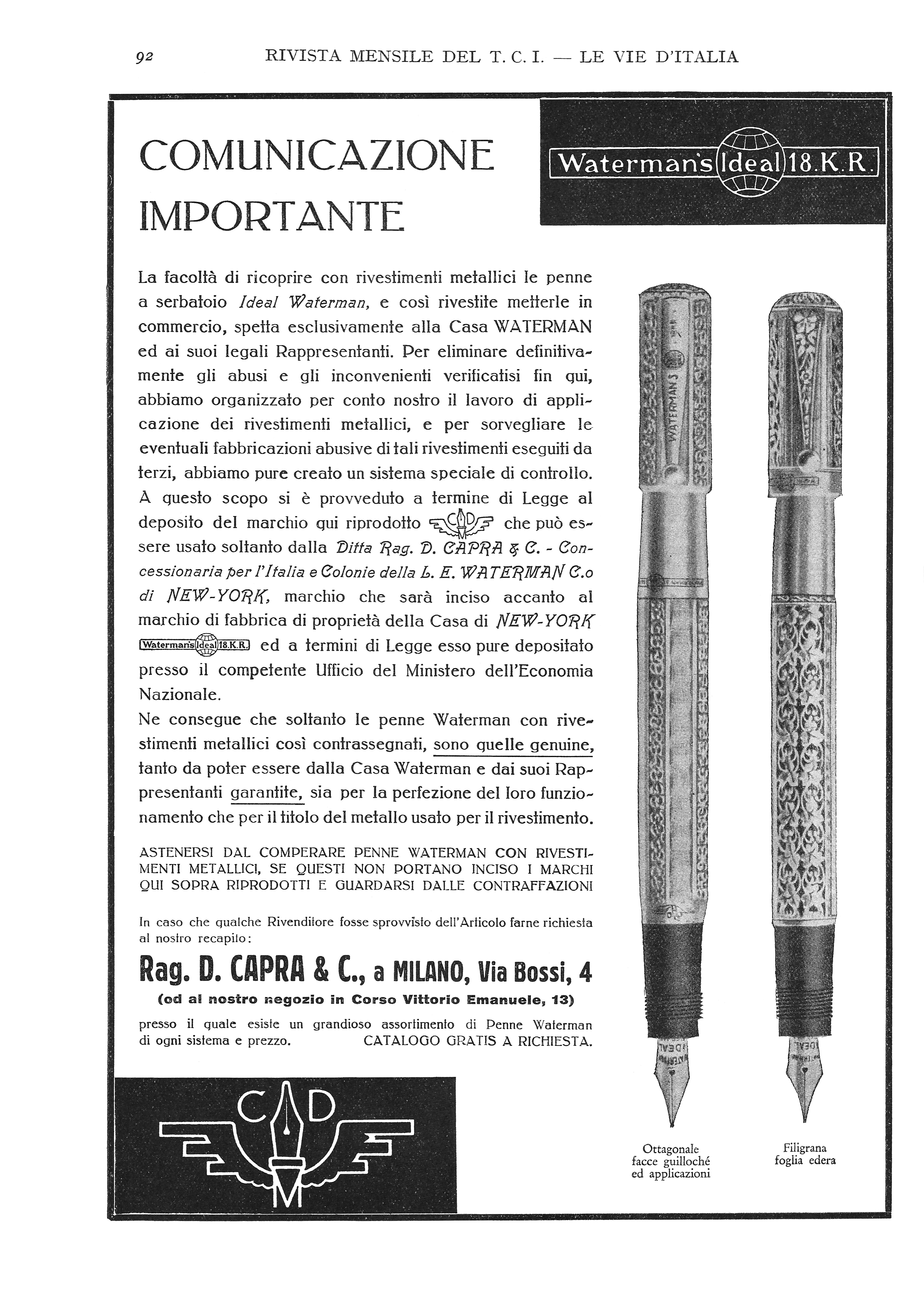 Scanning of advertising from Waterman dated 1931-03. Published on: Le vie d'Italia - Rivista mensile del Touring Club Italiano, year XXXVII, n. 3. Retouched by the author for a better sharpness. Dating established by finding the page in an archived version of the magazine. Warning by the italian agent about a stamped trademark used to certify the overlay autenticity for model derived from the 4x serie.