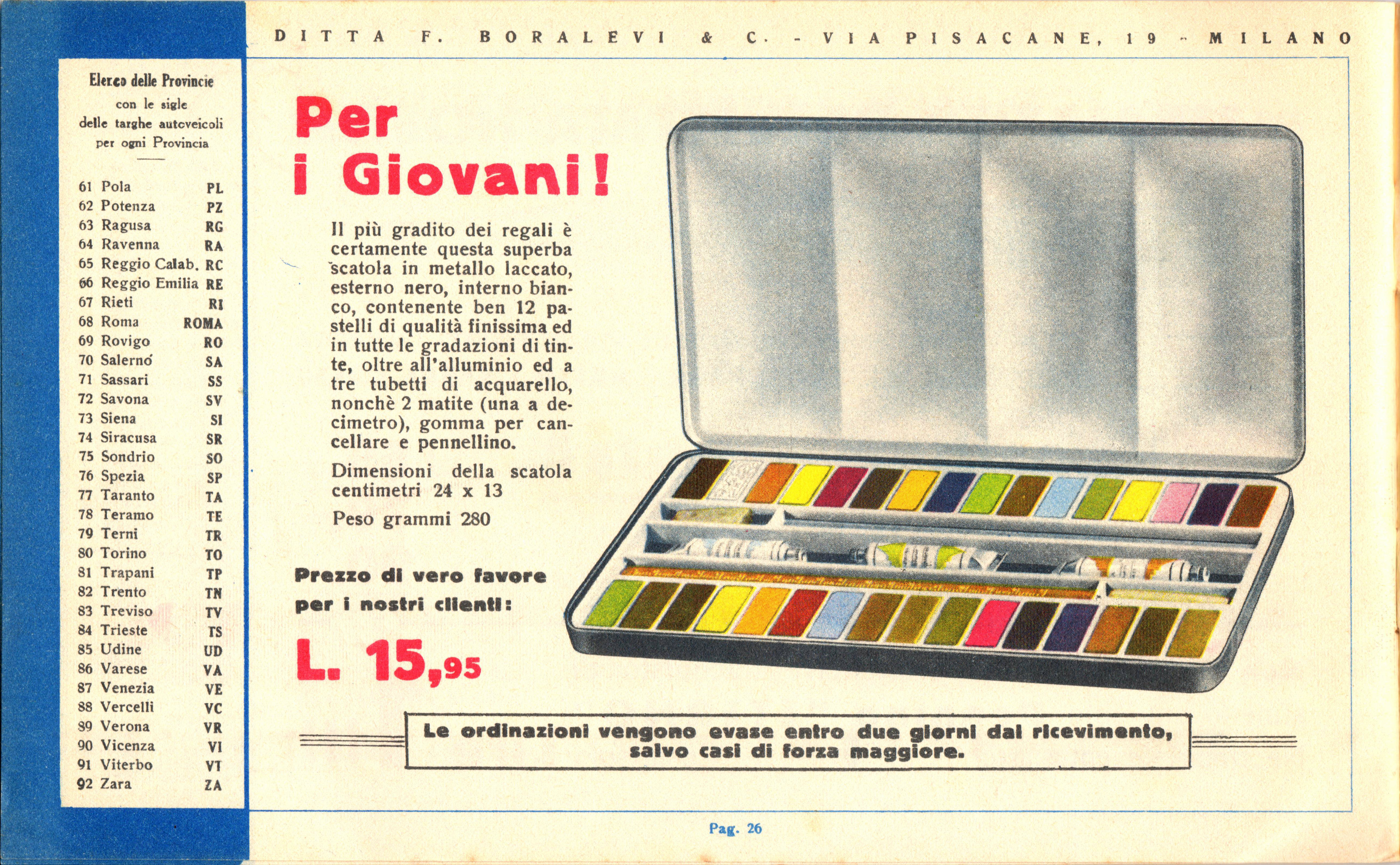 ({{AdsInfo |Marca=Boralevi |Data=1931-10 |Oggetto=catalog |Paese=IT |Ritocchi=yes |Contributo=anonimo |Datazione=otherpage |Note_it=Catalogo 1932, anno X°, N. 22, ottobre 1931 - aprile 1932. Ventiseisima pagina. Scatola colori. |Note_en=Catalog 1932,...) |