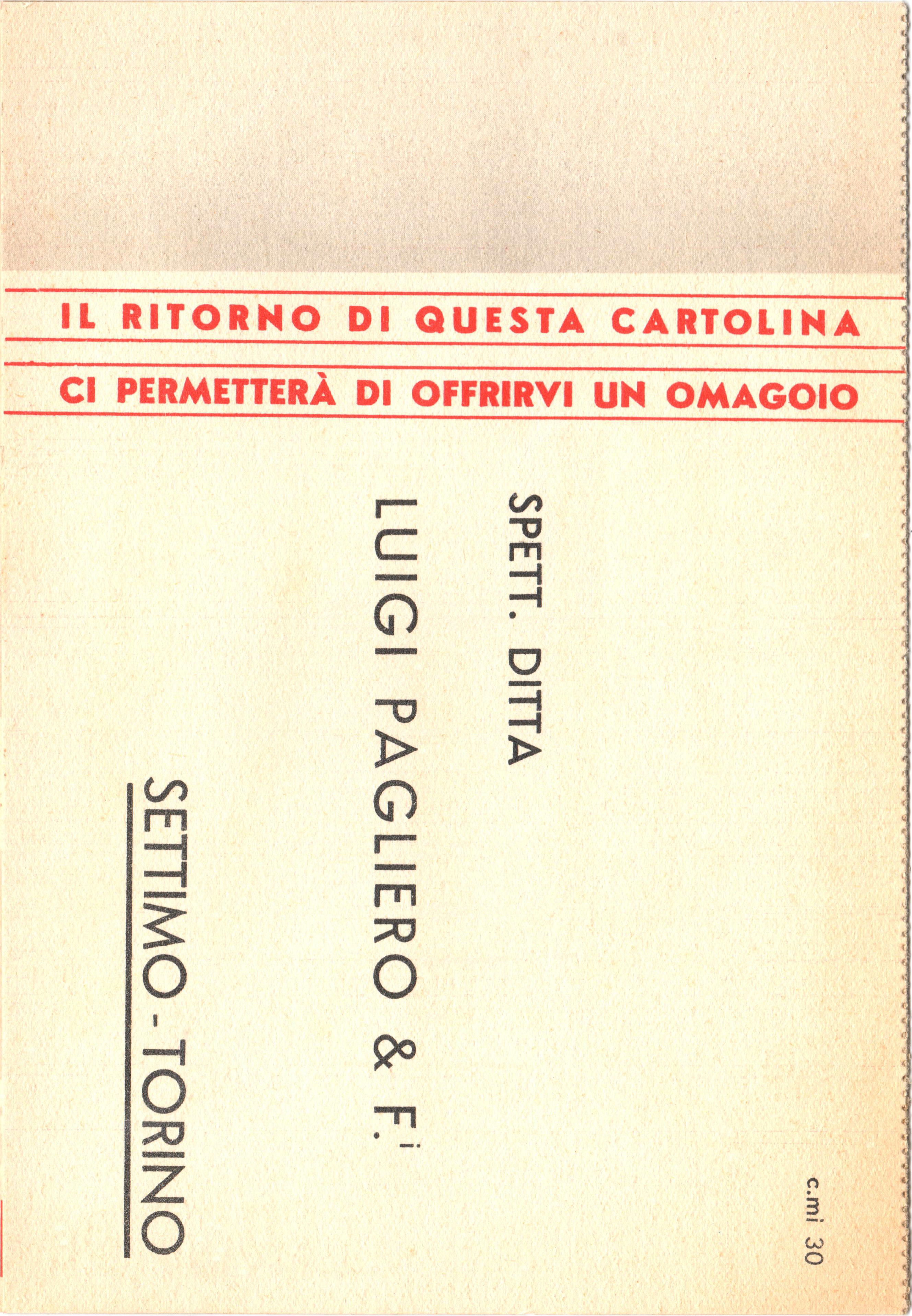 Scanning of a brochure from Pagliero dated 1936-09-23. Date reported on another page. Left external side of the double bend, usable as a postcard with its back. Address and gift promise if sent. On the other side of File:1936-09-Pagliero-Brochure-InternRight.jpg.