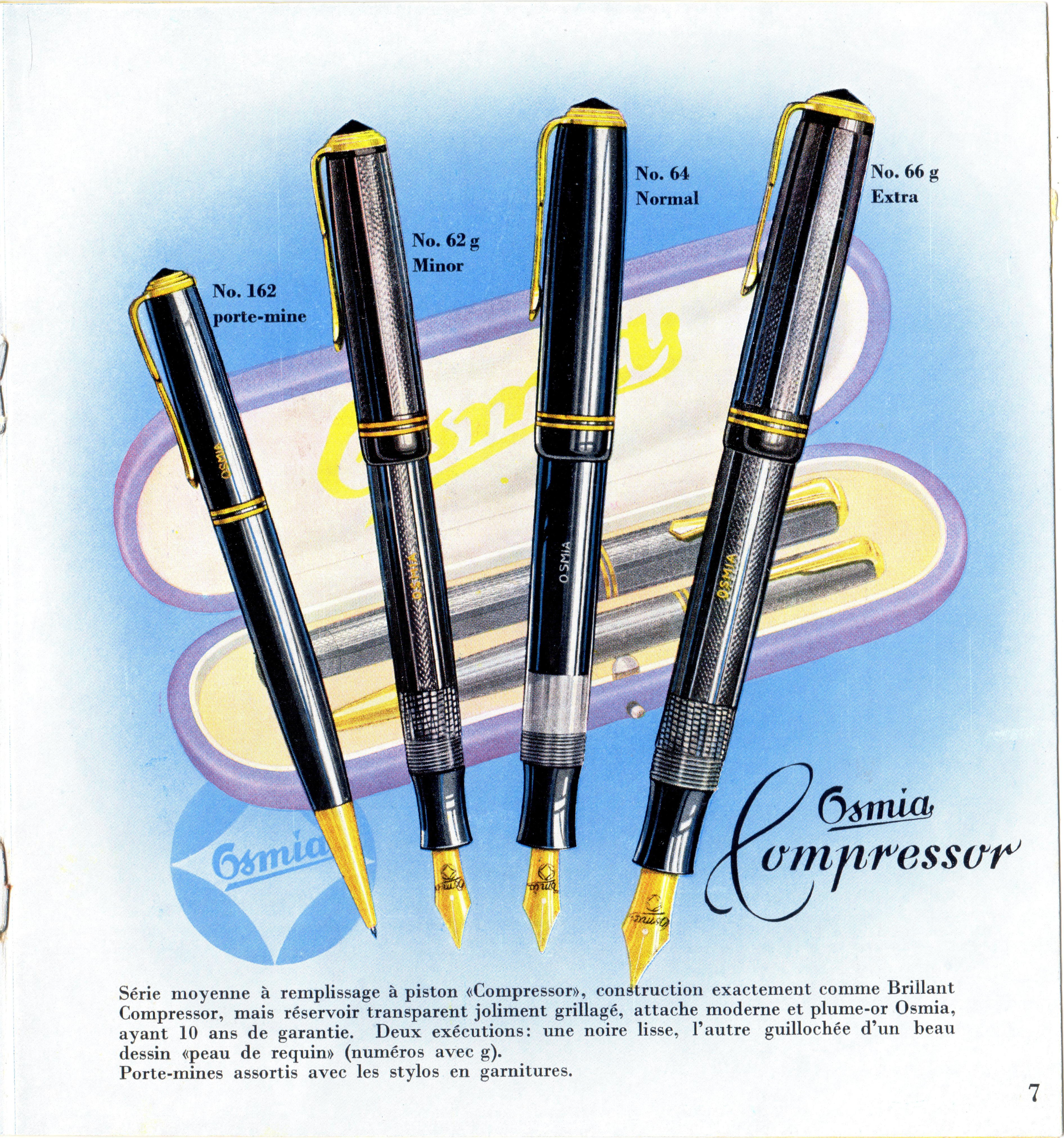 Scansione di una pagina di catalogo Osmia datata 1937-10. Ritoccata dall'autore per una migliore nitidezza. Data riportata su un'altra pagina. Pubblicizza il modello Compressor con caricamento a stantuffo e la matita meccanica abbinata. Menziona le tre dimensioni: 66 (Extra), 64 (Normal), 62 (Minor) nella variante liscia e le corrispondenti 66G, 64G, 62G nella variante cesellata. Settima pagina.