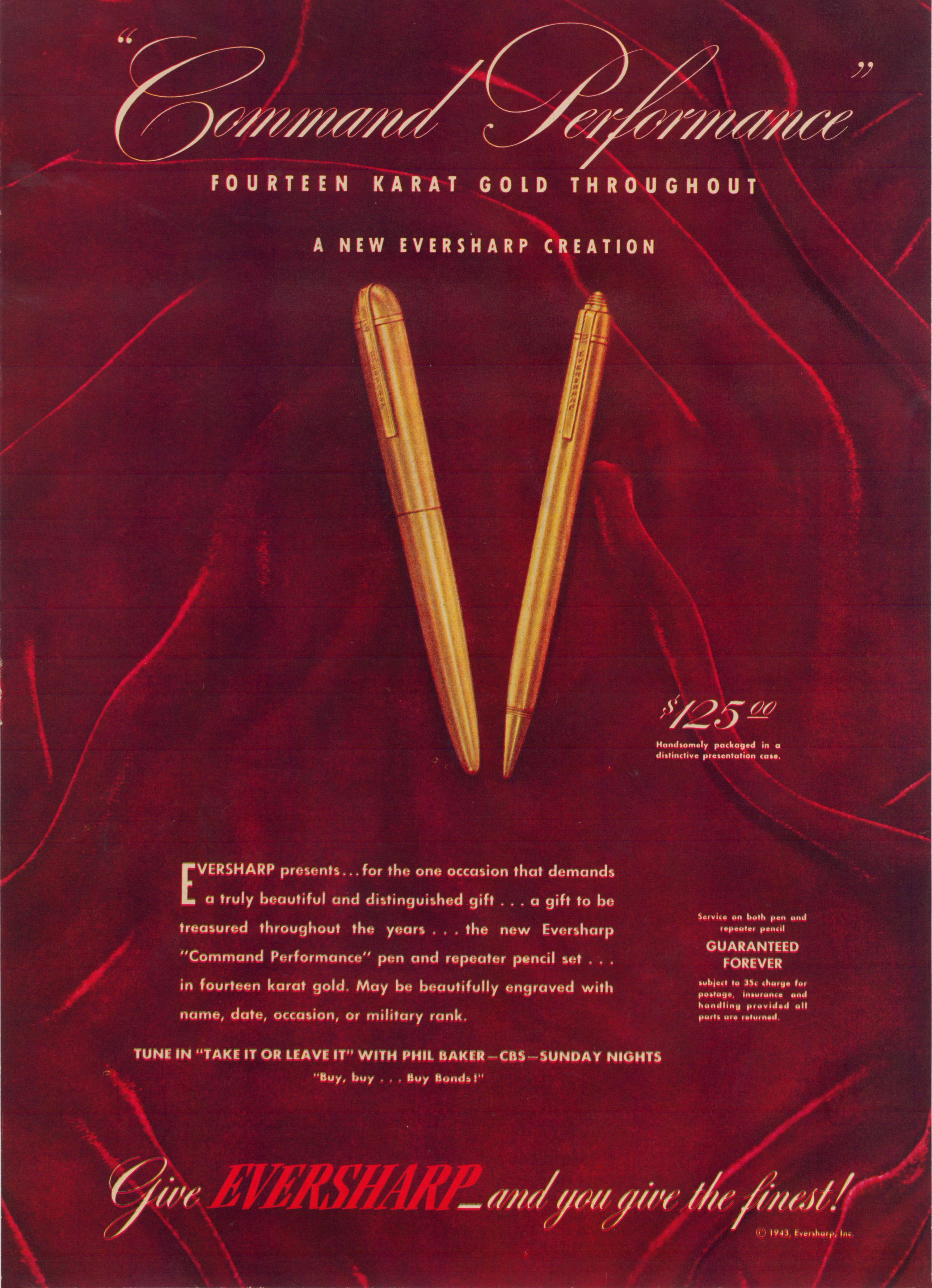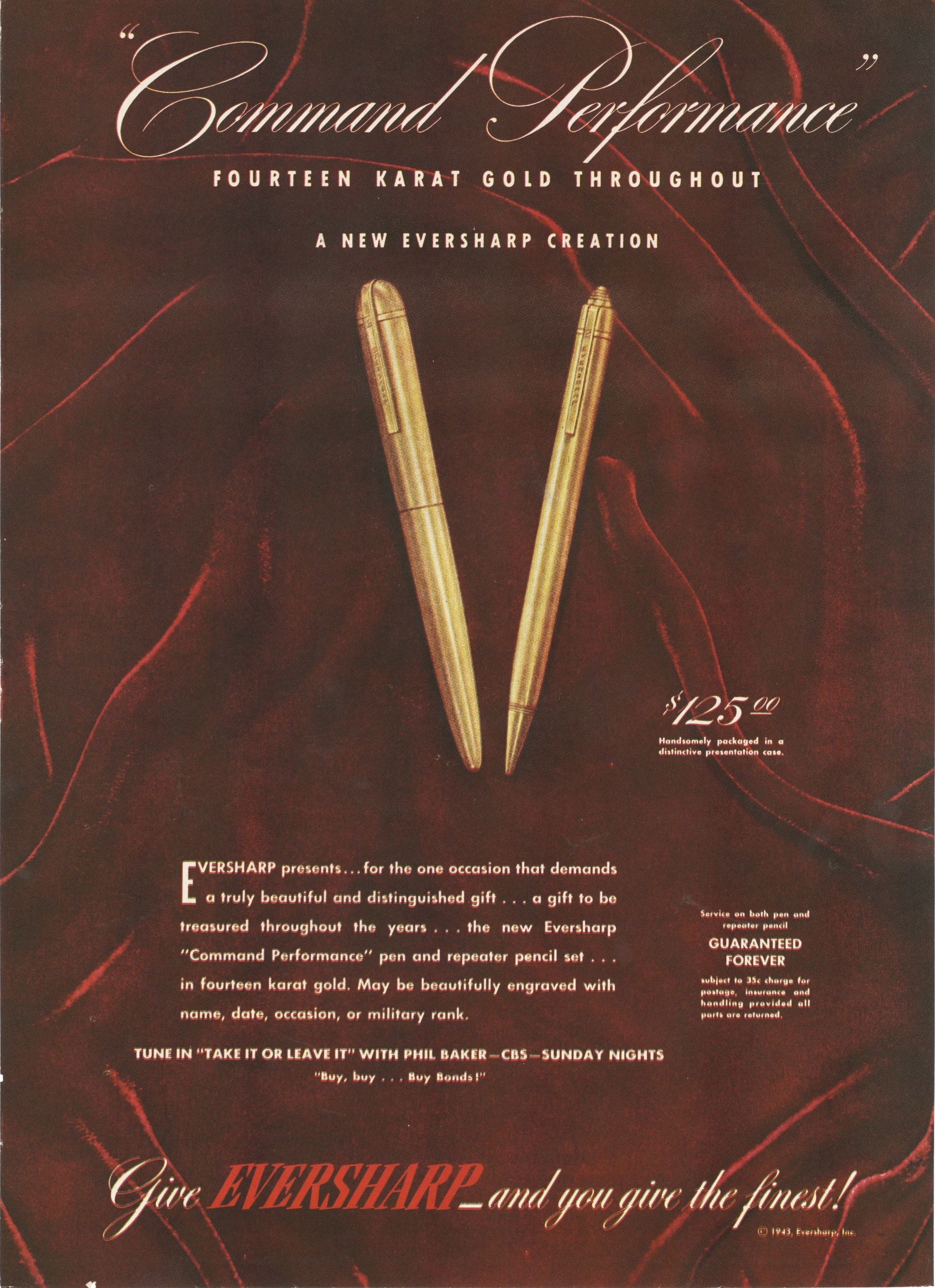 Scansione di una pubblicità Eversharp datata 1943-09-27. Pubblicazione su: Life. Ritoccata dall'autore per una migliore nitidezza. Data ottenuta dal reperimento della pagina su Google Books. Pubblicata anche su The Saturday Evening Post. Pubblicizza il modello Skyline nella versione "Command Performace" con rivestimento in oro massiccio.