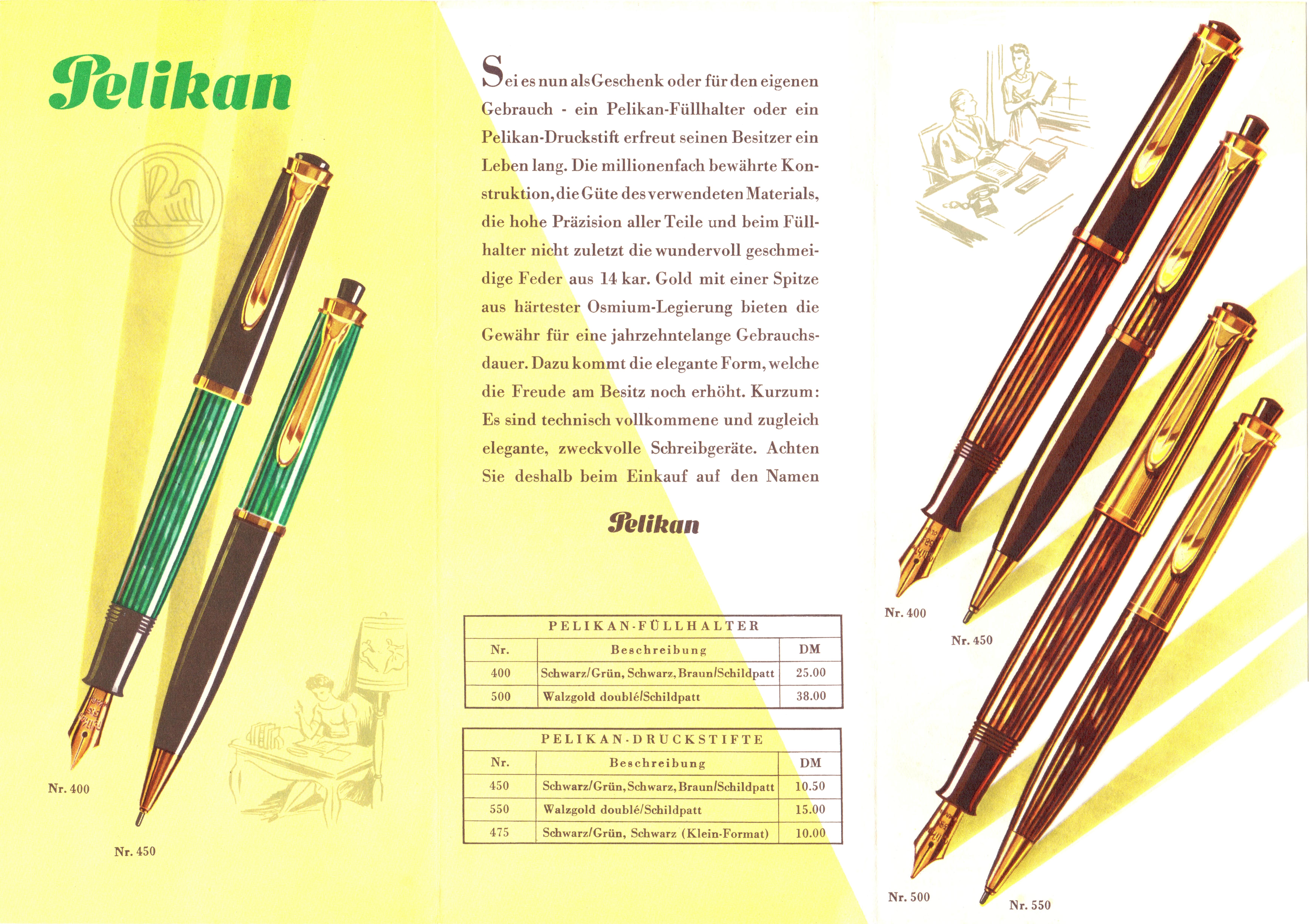 Scanning of advertising from Pelikan dated 1950. Retouched by the author for a better sharpness. Guess date, we used the year of the model launch. Advertising for the Pelikan 400 and Pelikan 500, showing also a nib table. On the other side of File:195x-Pelikan-400-Ext.jpg.