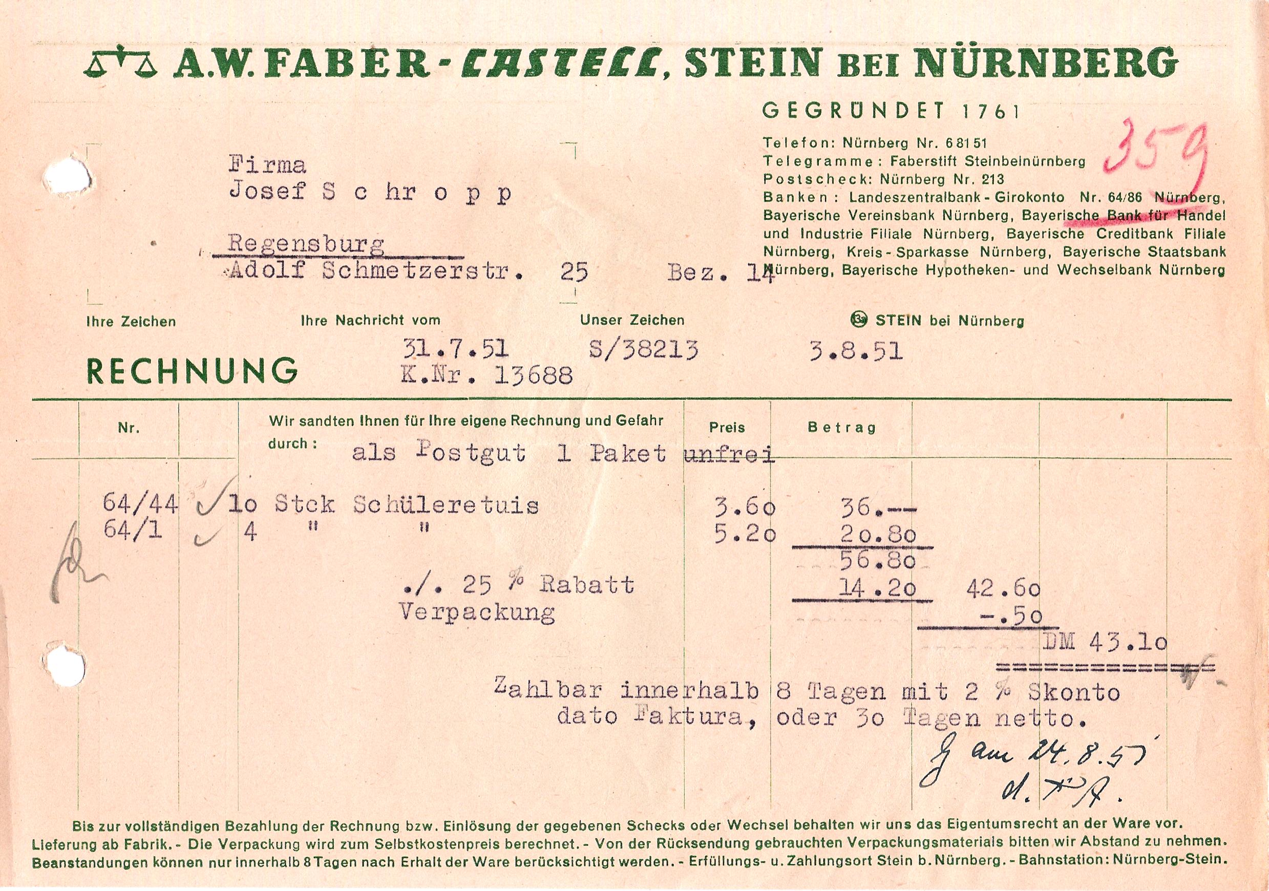 Scanning of an invoice from Faber Castell dated 1951-08-03. Date directly visible. Front of the sheet. On the other side of File:1951-08-FaberCastell-Invoice-Bk.jpg. Retouched by the author for a better sharpness.