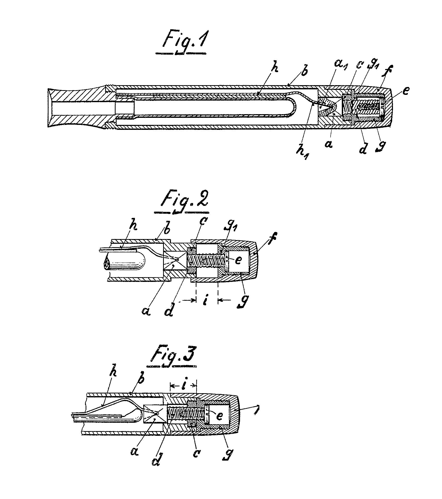 Schema del caricamento Push-knob della Montblanc. Estratto dalla prima pagina del brevetto originale (nº US-1826246). Ritoccato dall'autore per una maggiore nitidezza.