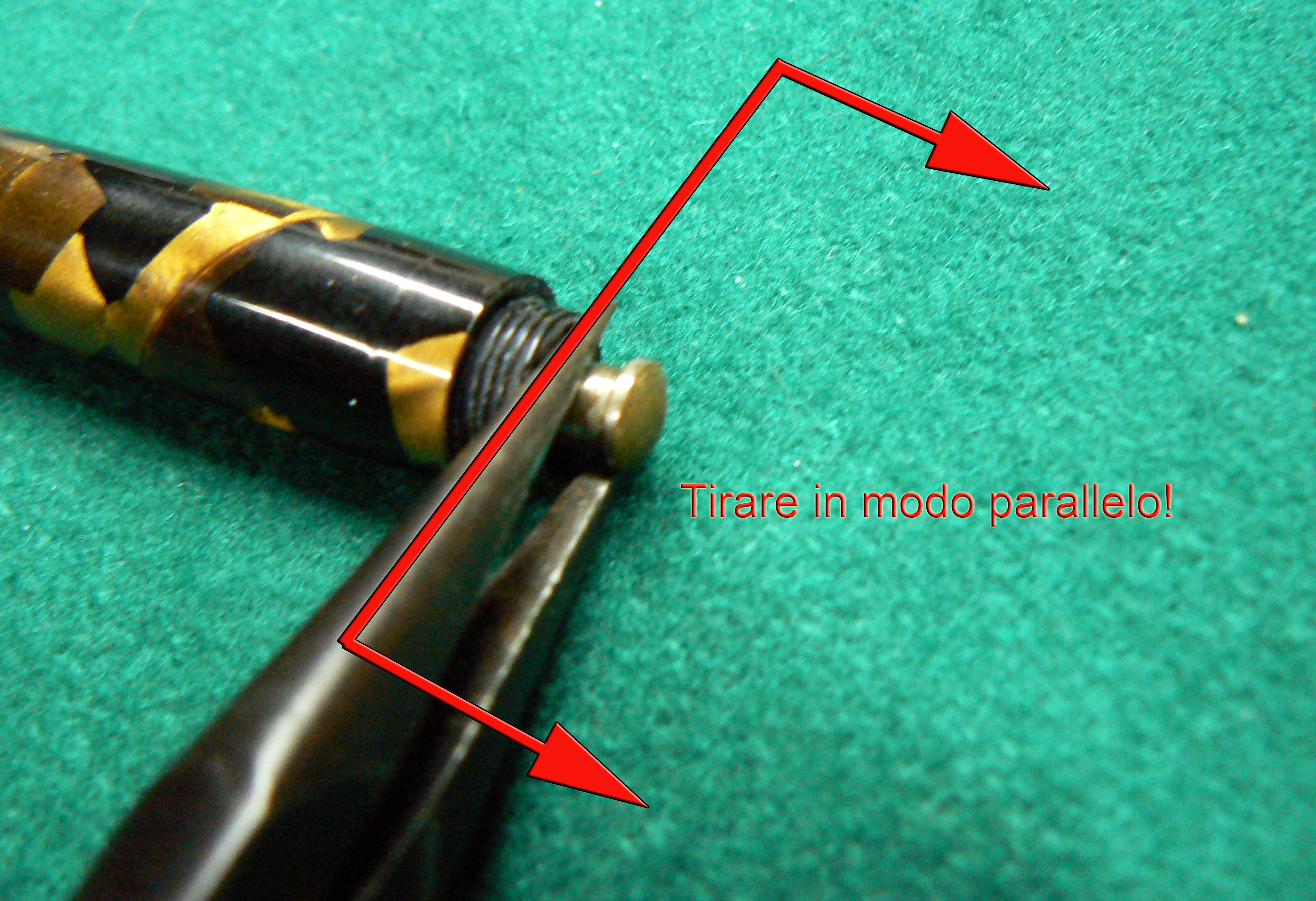Modalità di estrazione del pulsante di penna con caricamento a pulsante di fondo, nel caso sia eseguito con una pinza.
