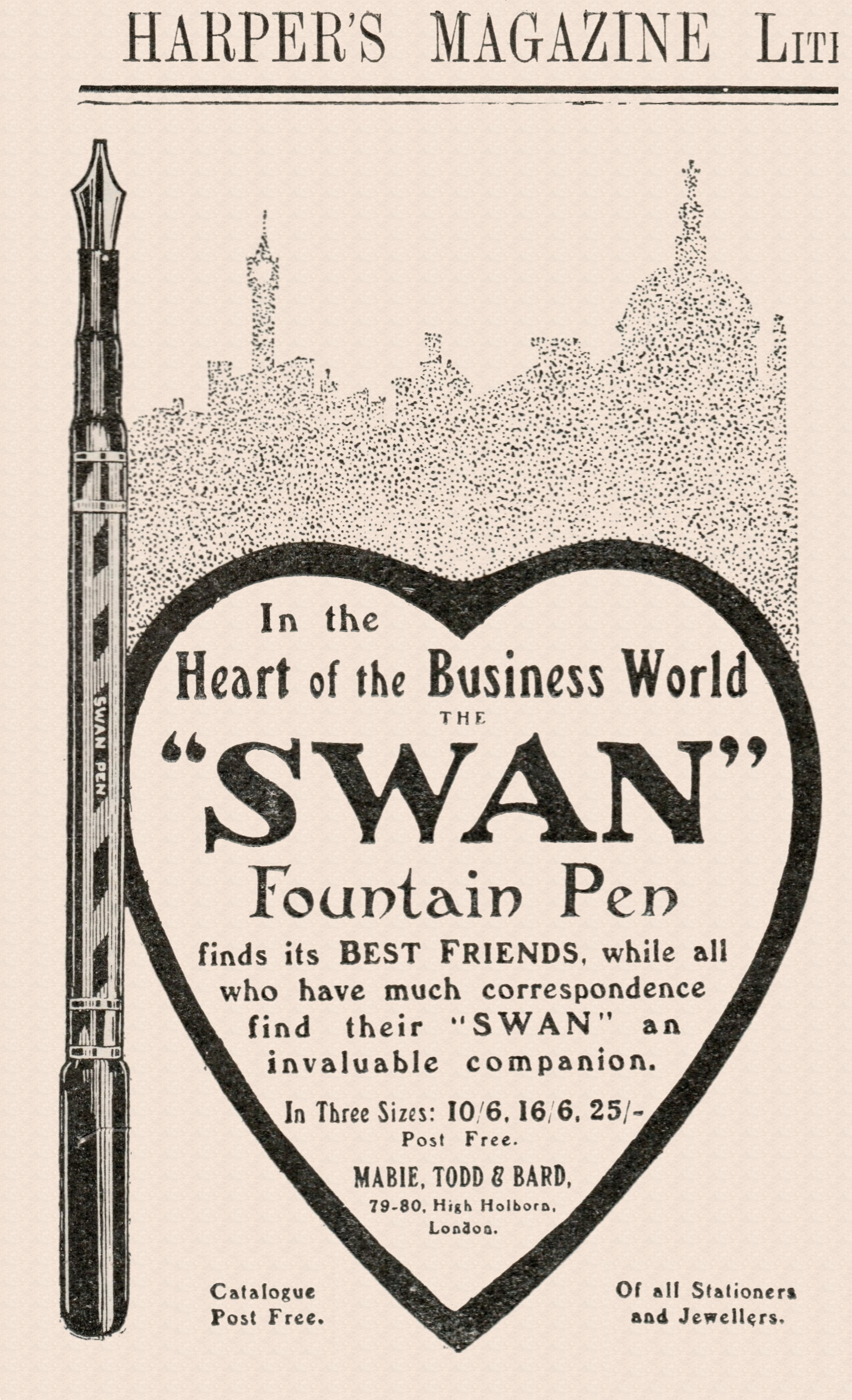 Scansione di una pubblicità Swan datata 1907-02. Pubblicazione su: Harper's Monthly Magazine, n. 681, pag. a. Indica come indirizzo: "79-80, High Holborn, London, WC". Contributo di Giorgio (utente forum Musicus). Data ottenuta da quella di pubblicazione del volume da cui la pagina è estratta. Pubblicizza una stilografica Swan Pen con straight cap. Cita l'azienda come: "Mabie, Todd & Bard".