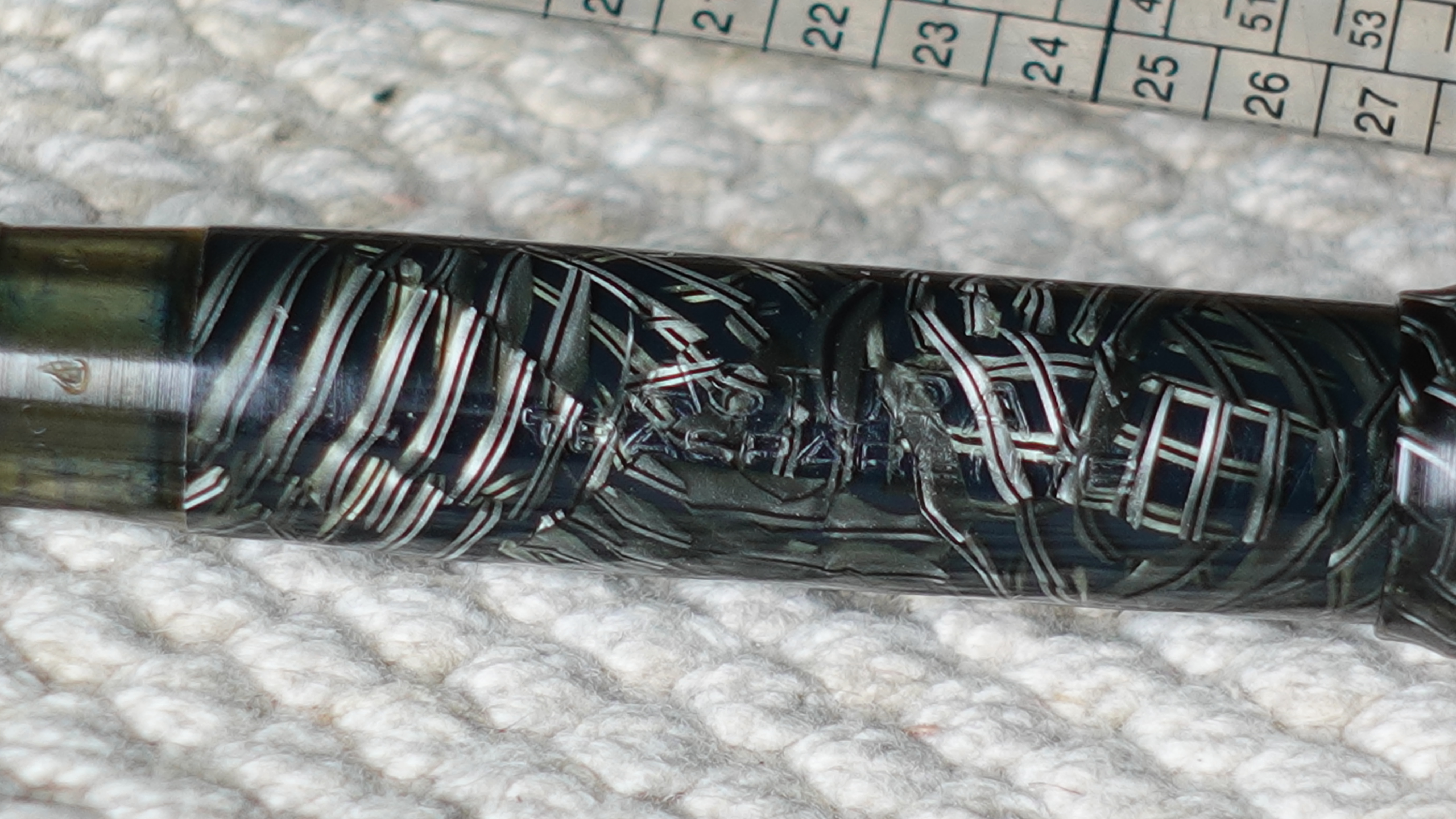 Photo of a pen produced by Astura (sub-band of Società Anonima Fabbrica Italiana Stilografiche). Model: Astura Trasparente. Filling system: button filler. In pine needles grey celluloid. Detail of inscription. Version with drop clip and openwork band.