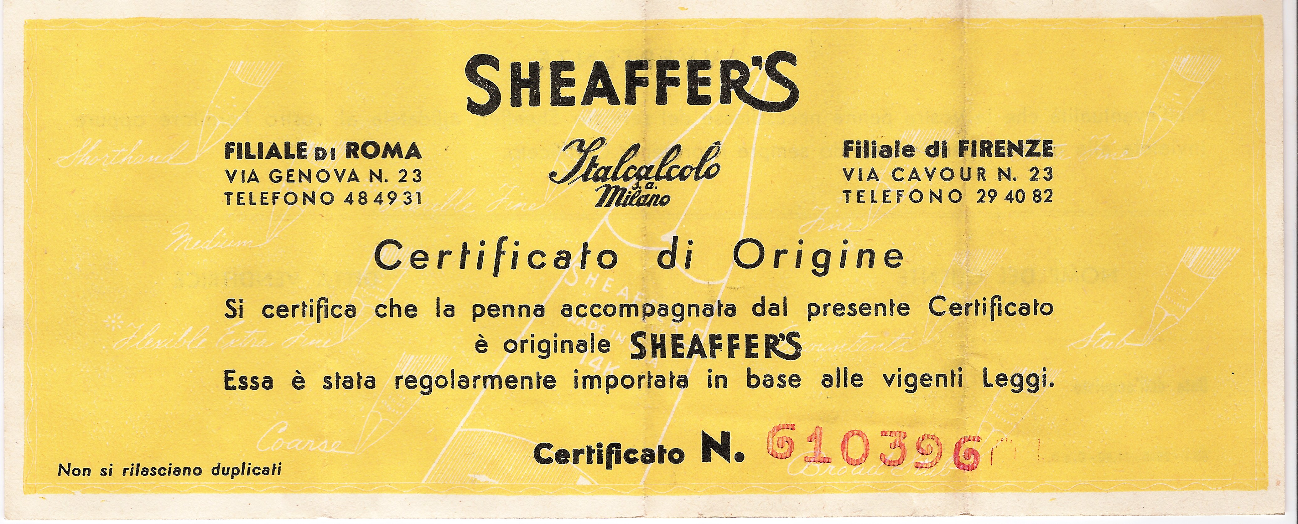 Scanning of a Sheaffer a warranty from '60s. For a PFM model. Citing "Italcalcolo Milano" (agent?). Retouched by the author for a better sharpness.