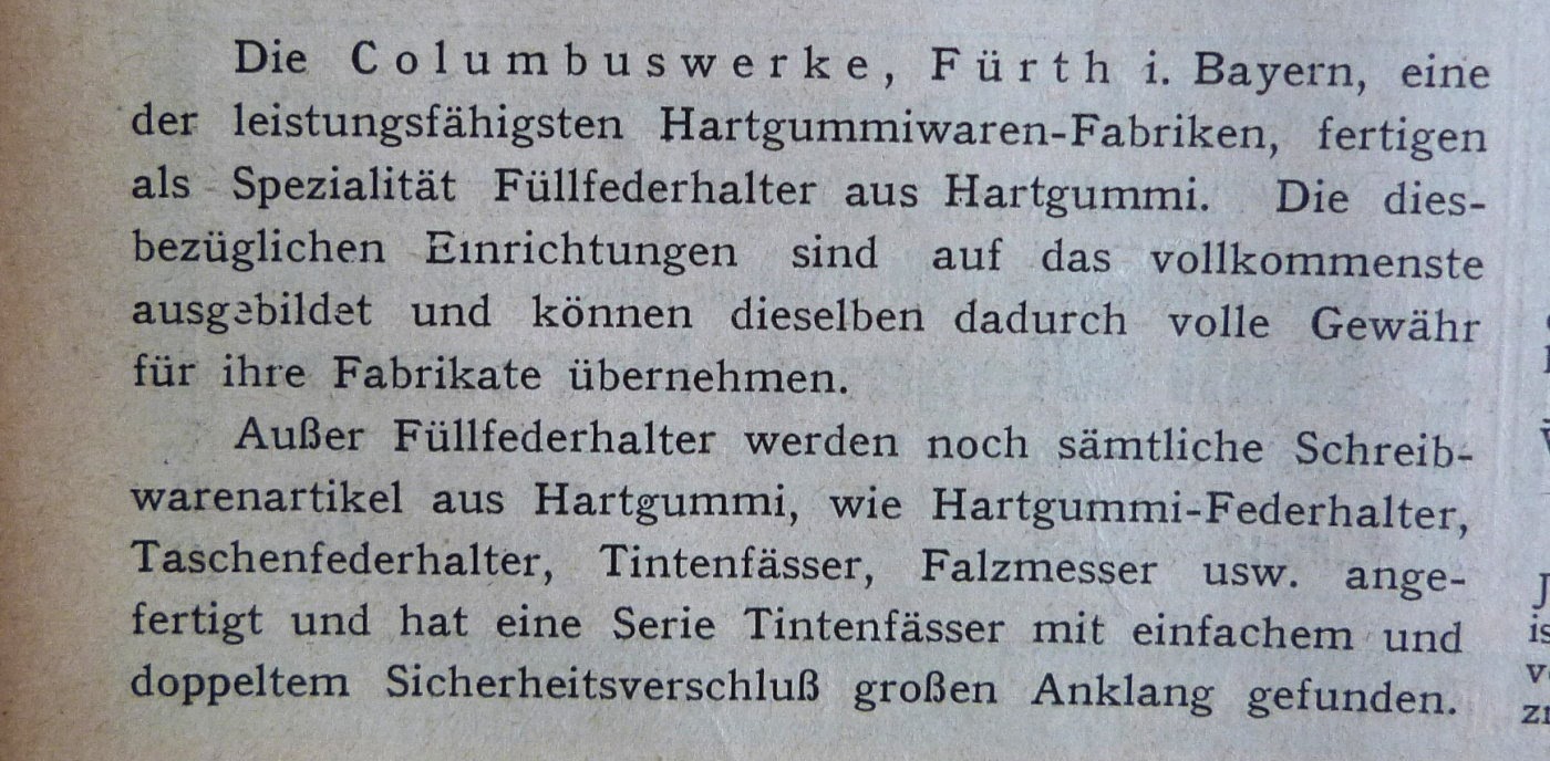 |Testo=Die Columbuswerke, Fürth i. Bayern, eine der leistungsfähigsten Hartgummiwaren-Fabriken, fertigen als Spezialität Füllfederhalter aus Hartgummi. Die dies-bezüglichen Einrichtungen sind auf das vollkommenste ausg2bildet und können dieselben dadurch volle Gewähr für ihre Fabrikate übernehmen. Außer Füllfederhalter werden noch sämtliche Schreib-warenartikel aus Hartgummi, wie Hartgummi-Federhalter, Taschenfederhalter, Tintenfässer, Falzmesser usw. ange-fertigt und hat eine Serie Tintenfässer mit einfachem und doppeltem Sicherheitsverschluß großen Anklang gefunden. | |Testo=Die Columbuswerke, Fürth i. Bayern, eine der leistungsfähigsten Hartgummiwaren-Fabriken, fertigen als Spezialität Füllfederhalter aus Hartgummi. Die dies-bezüglichen Einrichtungen sind auf das vollkommenste ausg2bildet und können dieselben dadurch volle Gewähr für ihre Fabrikate übernehmen. Außer Füllfederhalter werden noch sämtliche Schreib-warenartikel aus Hartgummi, wie Hartgummi-Federhalter, Taschenfederhalter, Tintenfässer, Falzmesser usw. ange-fertigt und hat eine Serie Tintenfässer mit einfachem und doppeltem Sicherheitsverschluß großen Anklang gefunden. | ||