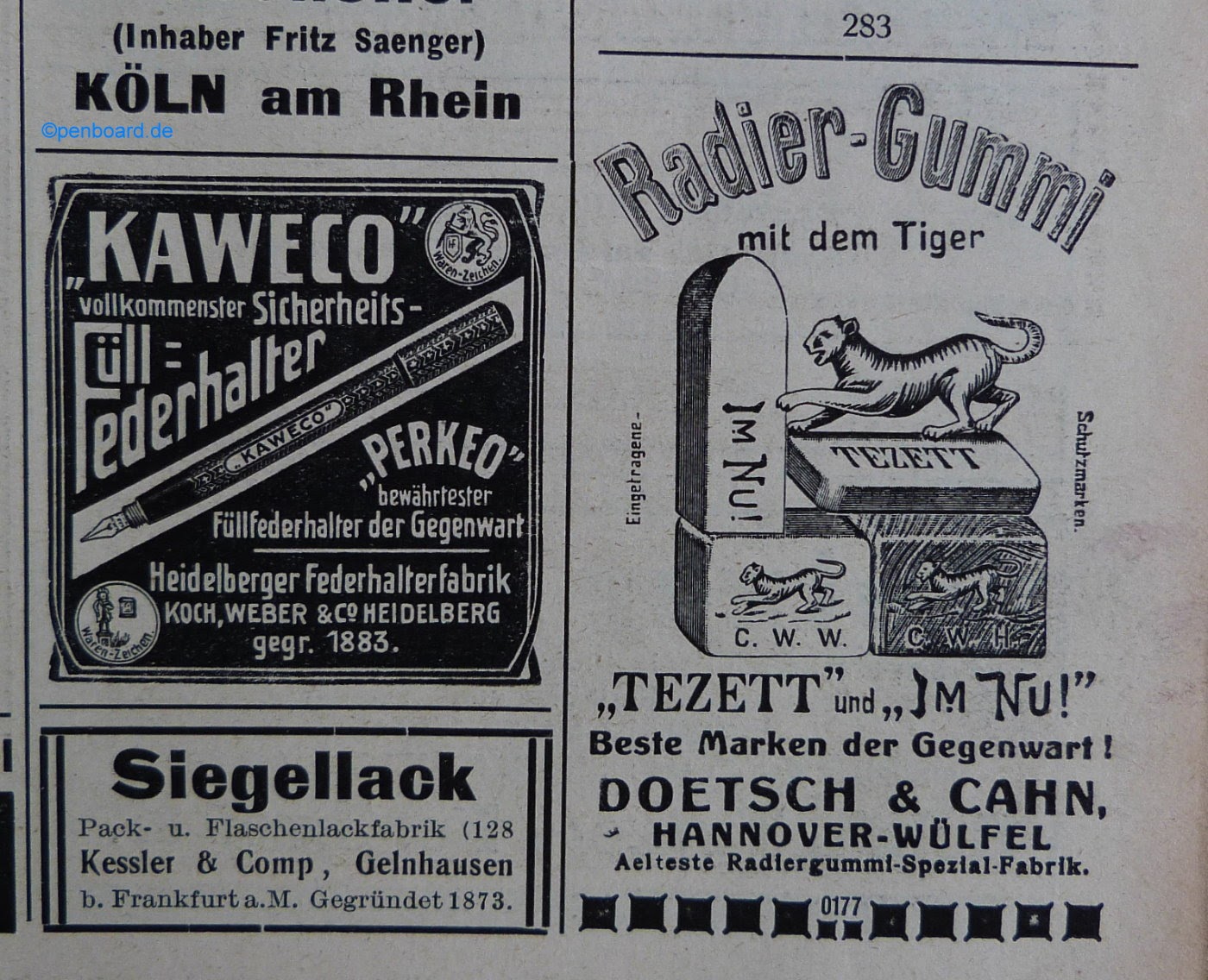 Scansione di una pubblicità datata 1909. Pubblicazione su: Der Papierhändler - Fachblatt Schreibwaren für Papier u. Büro-Bedarf. Riferimento all'azienda come: "Heidelberger Federhalter-Fabrik, Koch, Weber & Co. A.-G.". Indica come indirizzo: "Heidelberg". Contributo di Tom Westerich, https://www.penboard.de. Data visibile direttamente. Pagina di pubblicità varie per articoli di cancelleria con un riquadro concernente penne stilografiche, una pubblicità Kaweco che cita la serie Perkeo e la data di fondazione del 1883.