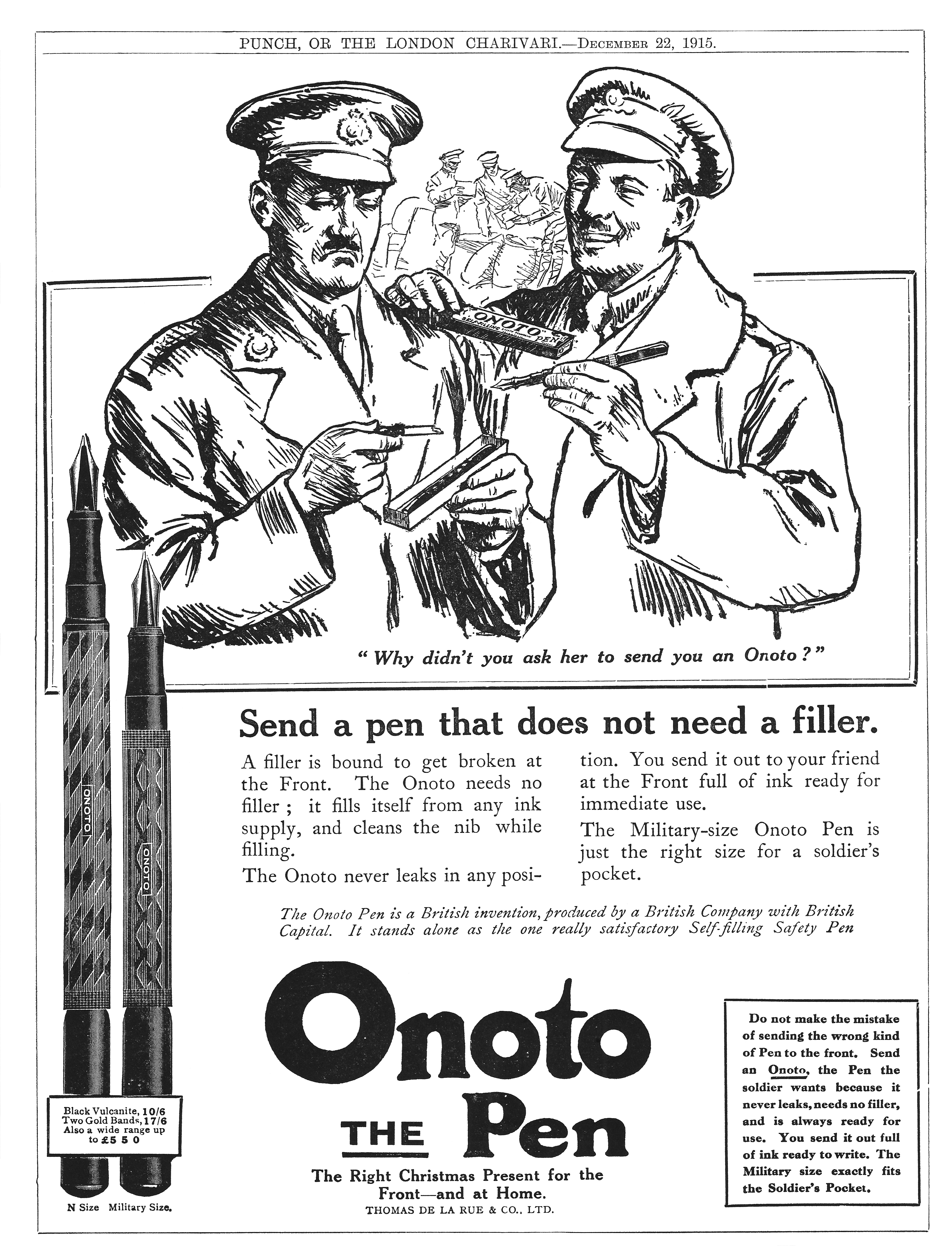 Scansione di una pubblicità Onoto datata 1915-12-22. Pubblicazione su: Punch - or the London Charivari. Riferimento all'azienda come: "Thomas De La Rue & Co. Ltd.". Usa lo slogan: "Onoto The Pen". Ritoccata dall'autore per una migliore nitidezza. Data riportata sul retro del foglio. Pubblicizza delle penne della serie N.