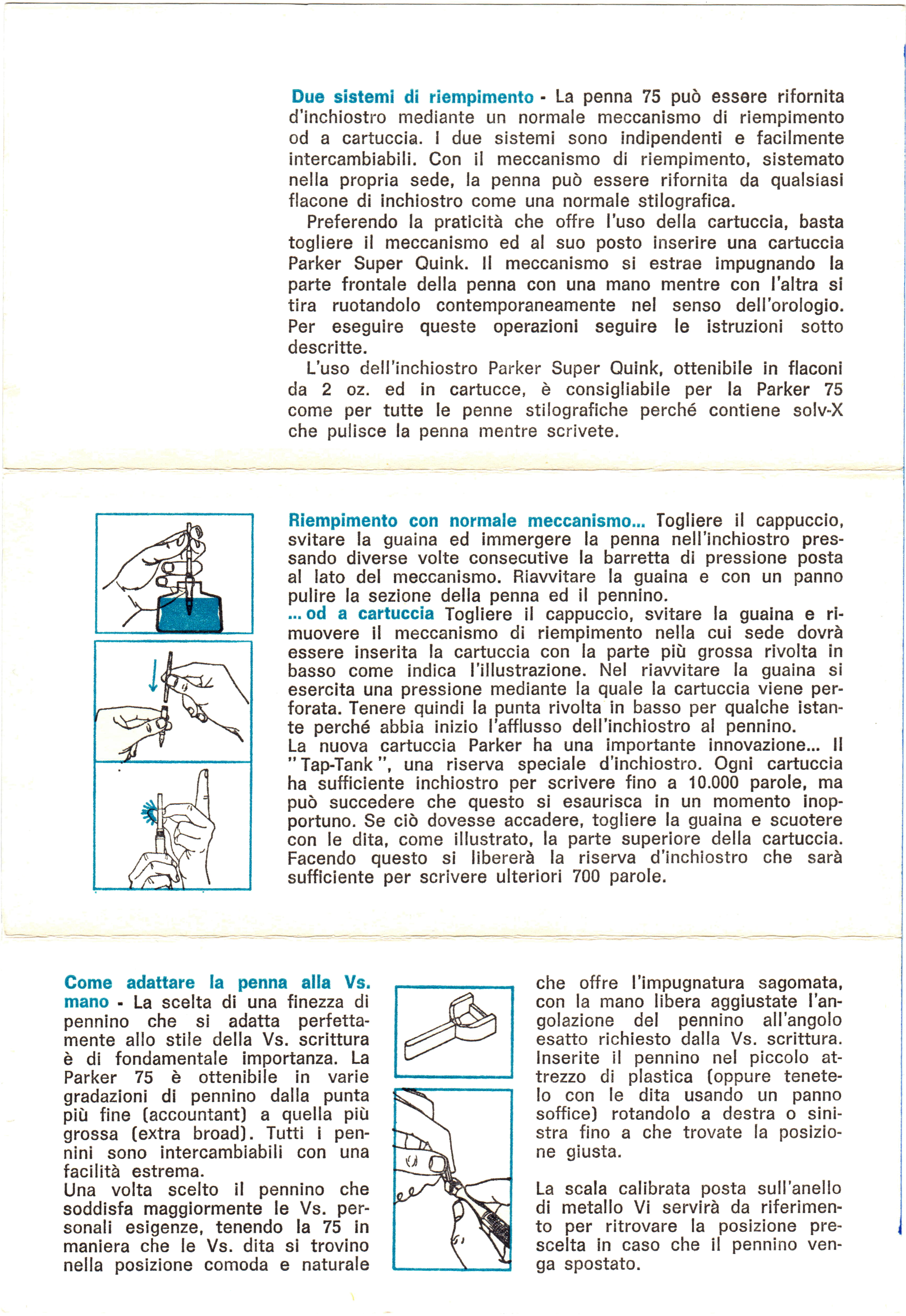 Scansione di un foglietto di istruzioni Parker degli anni '60. Relativo ad un modello Parker 75. Libretto di istruzioni, lato interno. Sull'altro lato di File:196x-Parker-75-Instr-IT-Ext.jpg. Ritoccata dall'autore per una migliore nitidezza.
