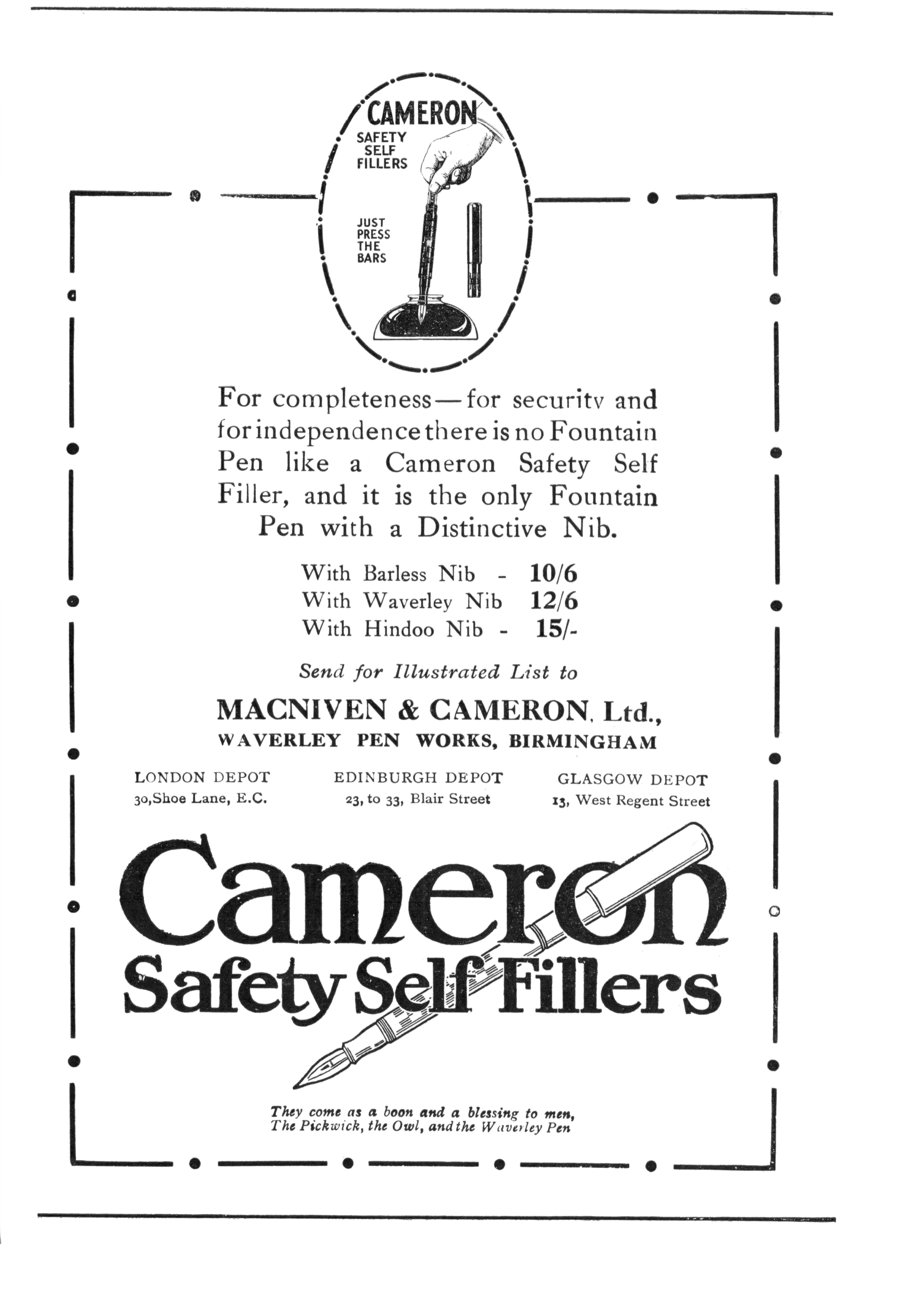 Scansione di una pubblicità Cameron datata 1918. Riferimento all'azienda come: "Macniven & Cameron Ltd.". Indica come indirizzo: "Waverley Pen Works, Birmingham". Ritoccata dall'autore per una migliore nitidezza. Data indicativa, per indicare la fine degli anni '10, indicativo del periodo dal modello e dall'assenza di riferimenti bellici. Pubblicizza il modello Cameron Safety Self Filler. Cita i diversi tipi di pennini disponibili: Hindoo nib, Waverley nib, Barless nib.