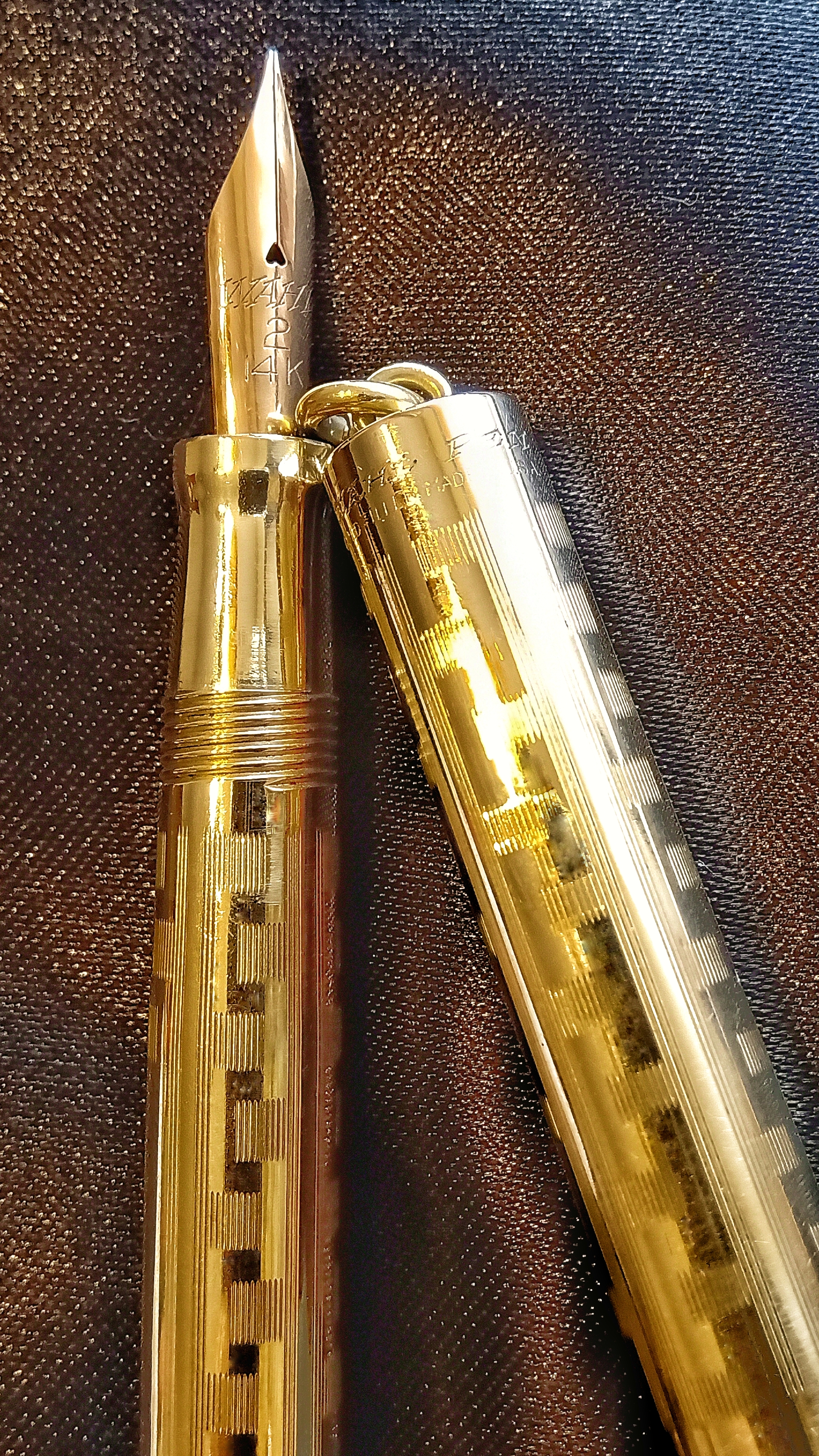 Foto di una penna Eversharp. Modello: Wahl Metal Pen. Caricamento a levetta. Realizzazione in metallo laminato oro con lavorazione guilloché. Misura piccola, da signora, nella lavorazione Grecian Border, versione con sezione rivestita. Contributo di Gustavo, (utente forum gfrico2000).
