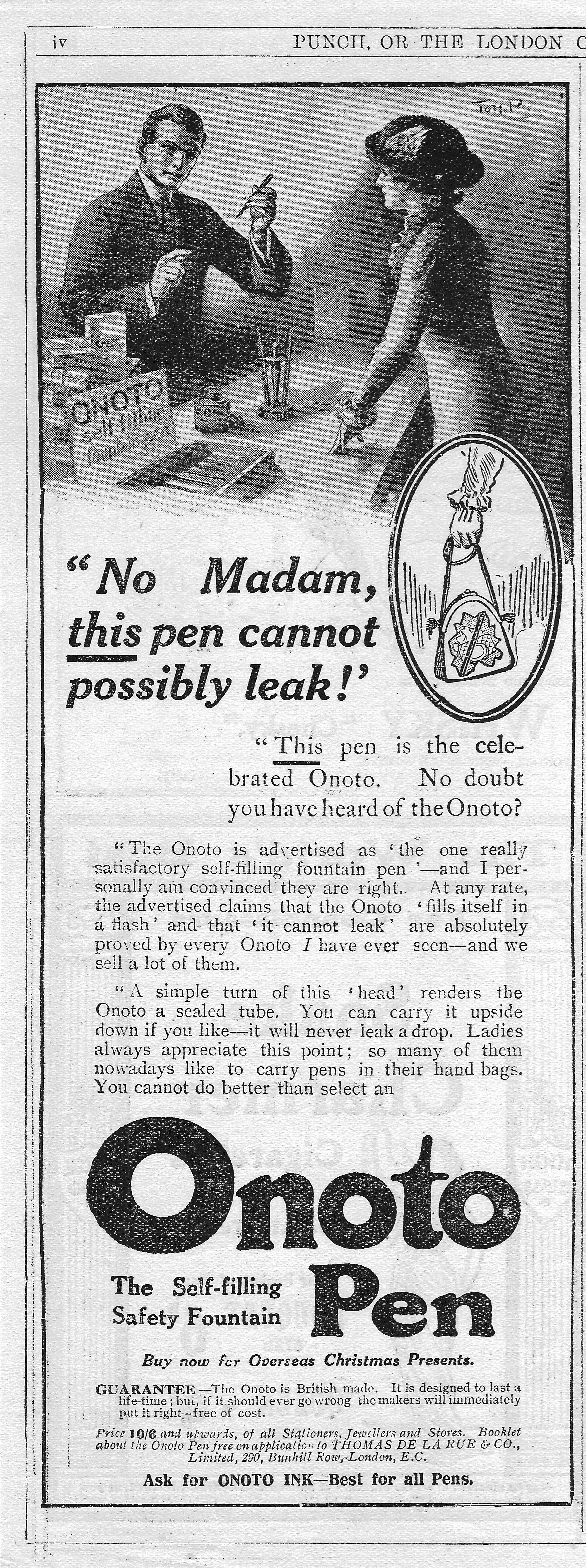 Scansione di una pubblicità Onoto datata 1913-11-26. Pubblicazione su: Punch - or the London Charivari. Realizzata da: Tom Purvis. Riferimento all'azienda come: "Thomas De La Rue & Co.". Indica come indirizzo: "290, Bunhill Road, London, E.C.". Ritoccata dall'autore per una migliore nitidezza. Data riportata sul retro del foglio. Pubblicizza delle penne della serie N.