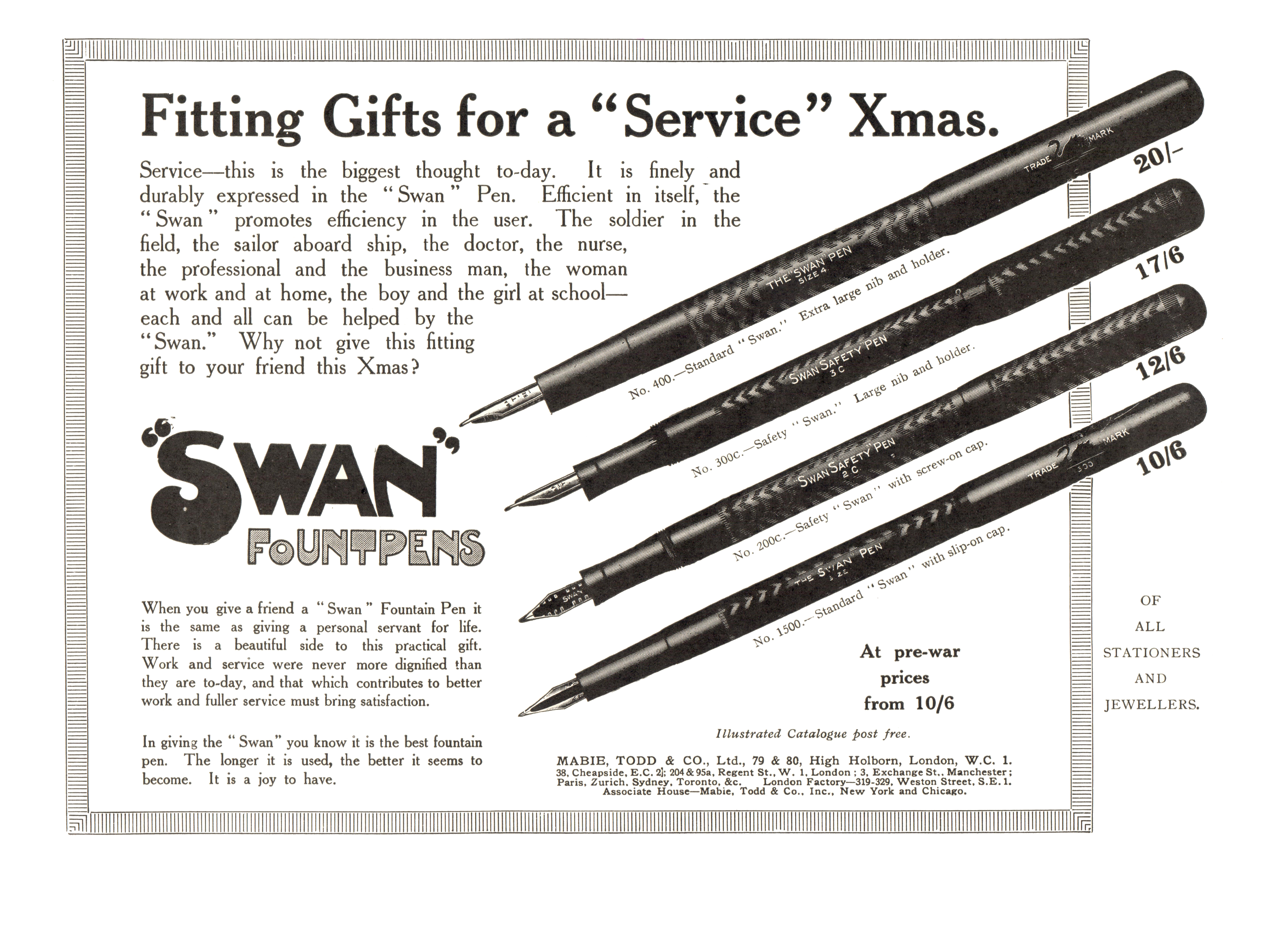 Scansione di una pubblicità Swan datata 1917-12. Riferimento all'azienda come: "Mabie, Todd & Co. Ltd.". Indica come indirizzo: "79 & 80, High Holborn, London, W.C. 1". Data da un riferimento sul retro del foglio, a delle agende per il 1918, cosa che, insieme al tema del regalo natalizio a chi è in servizio, indica la fine del 1917. Pubblicizza quattro diversi modelli, con una numerazione di significato incerto: una Swan Pen marcata "Size 4" con pennino grande, indicata come Swan No. 400, una Swan Safety Pen 3C indicata come Swan No. 300c, una Swan Safety Pen 2C indicata come Swan No. 200c una seconda Swan Pen con pennino indicata come Swan No. 1500, ma marcata 300 sul cappuccio.