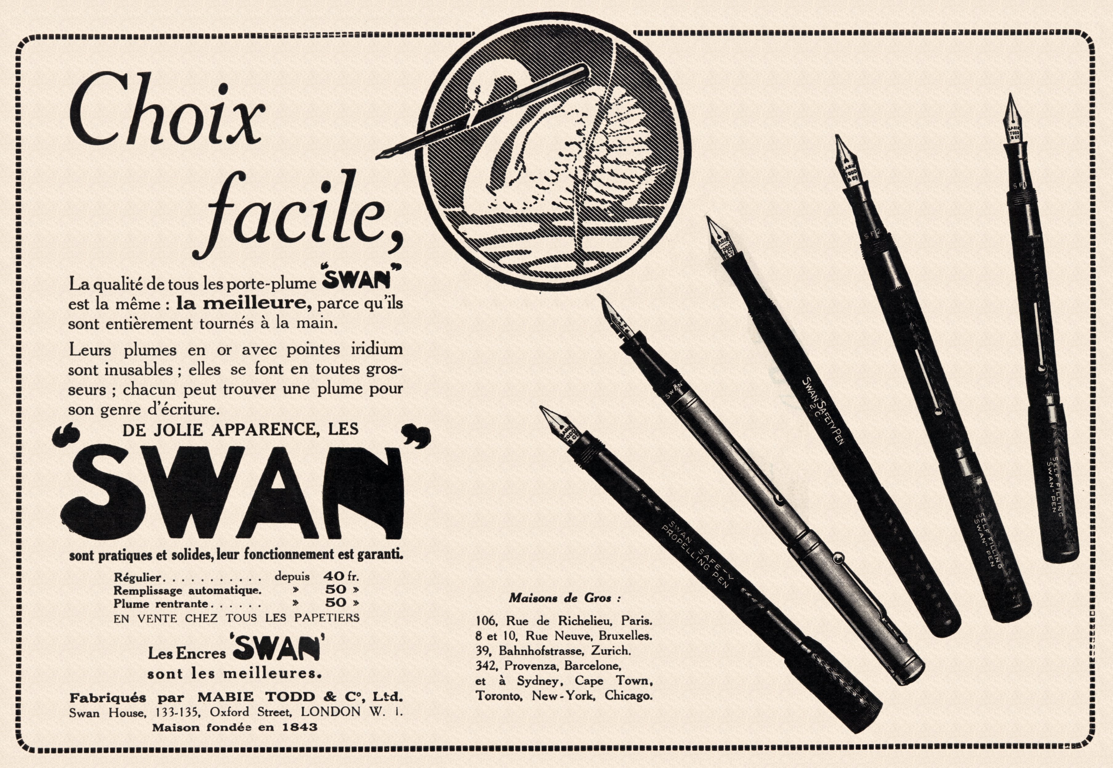 Scanning of advertising from Swan dated 1924. Refers to the company as: "Mabie, Todd & Co. Ltd.". Mention as address: "Swan Home, 133 & 135, Oxford Street, London". Retouched by the author for a better sharpness. Dating given by the provider. Advertising for the models of that time with different filling systems (''Régulier", "Remplissage automatique", "Plume Rentrante") marked Swan Safety Pen 2C, Swan Safety Propelling Pen, Self Filling Swan Pen (in both Swan SF 2 and Swan SF 1 version).