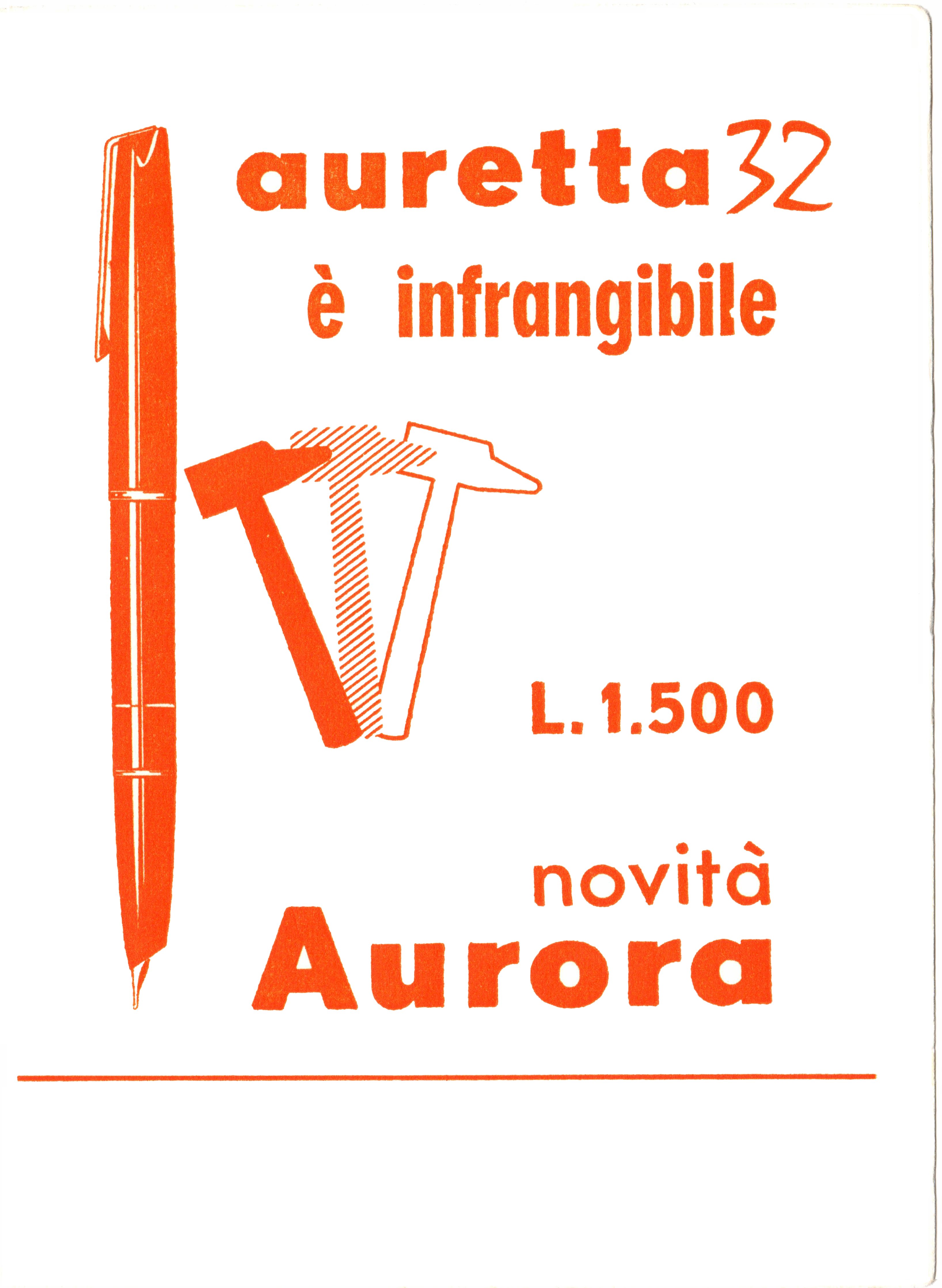 Scansione di un foglio di carta assorbente Aurora datata 1966. Ritoccata dall'autore per una migliore nitidezza. Contributo di Paolo, http://www.zona900.it, (utente forum fountainpen.it sanpei). Data indicativa, indicante la seconda metà degli anni '60. Pubblicizza il modello Auretta 32.