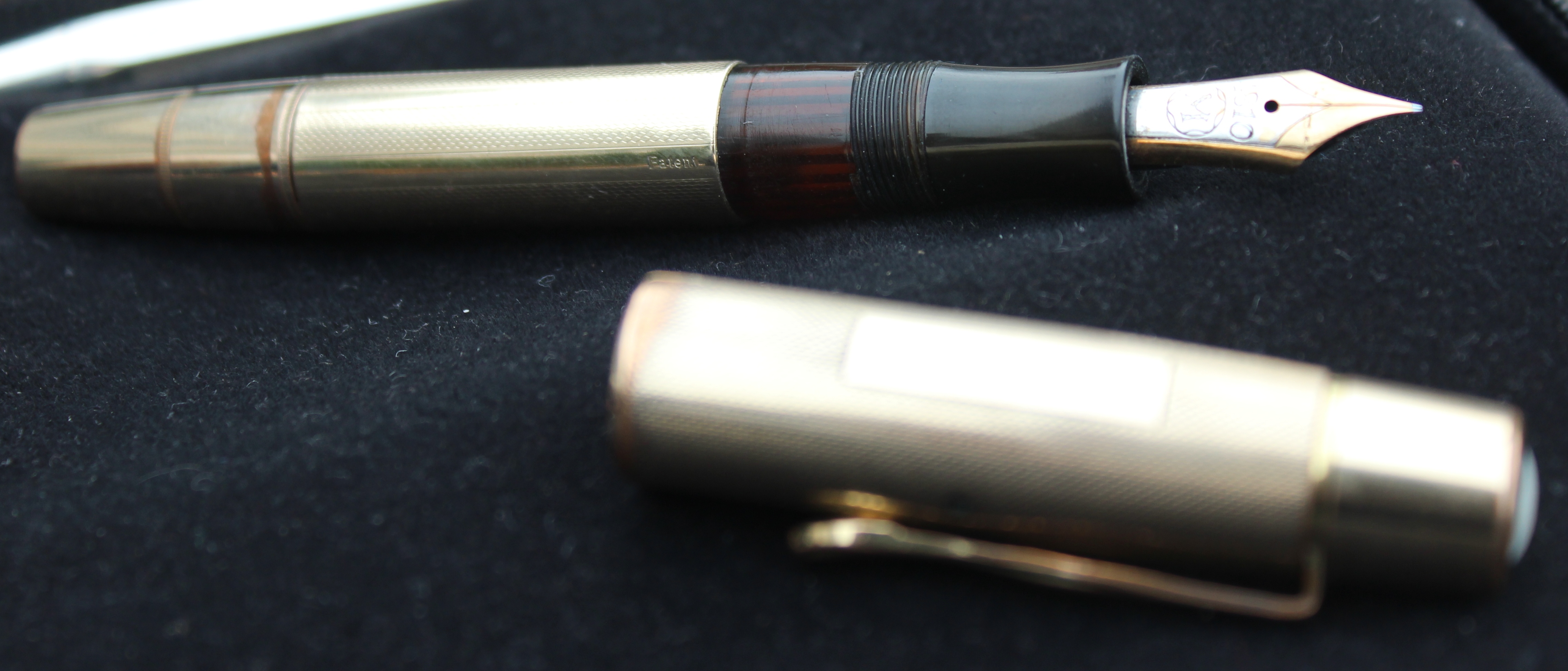 Photo of a pen produced by Montblanc. Model: Montblanc 136. Filling system: piston filler. With barleycomb gold rolled overlay. Photographed at 2014 Cologne Pen Show.