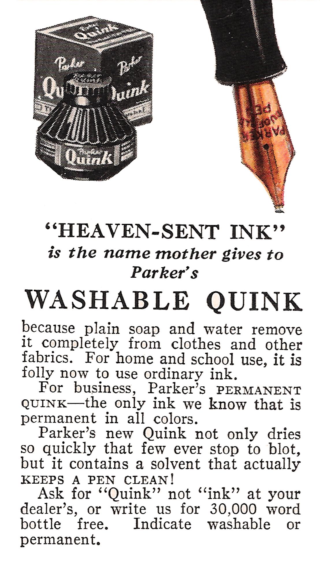 Illustration for the new Quink dry ink. Except from the scanning of a 1931 Parker advertisement.