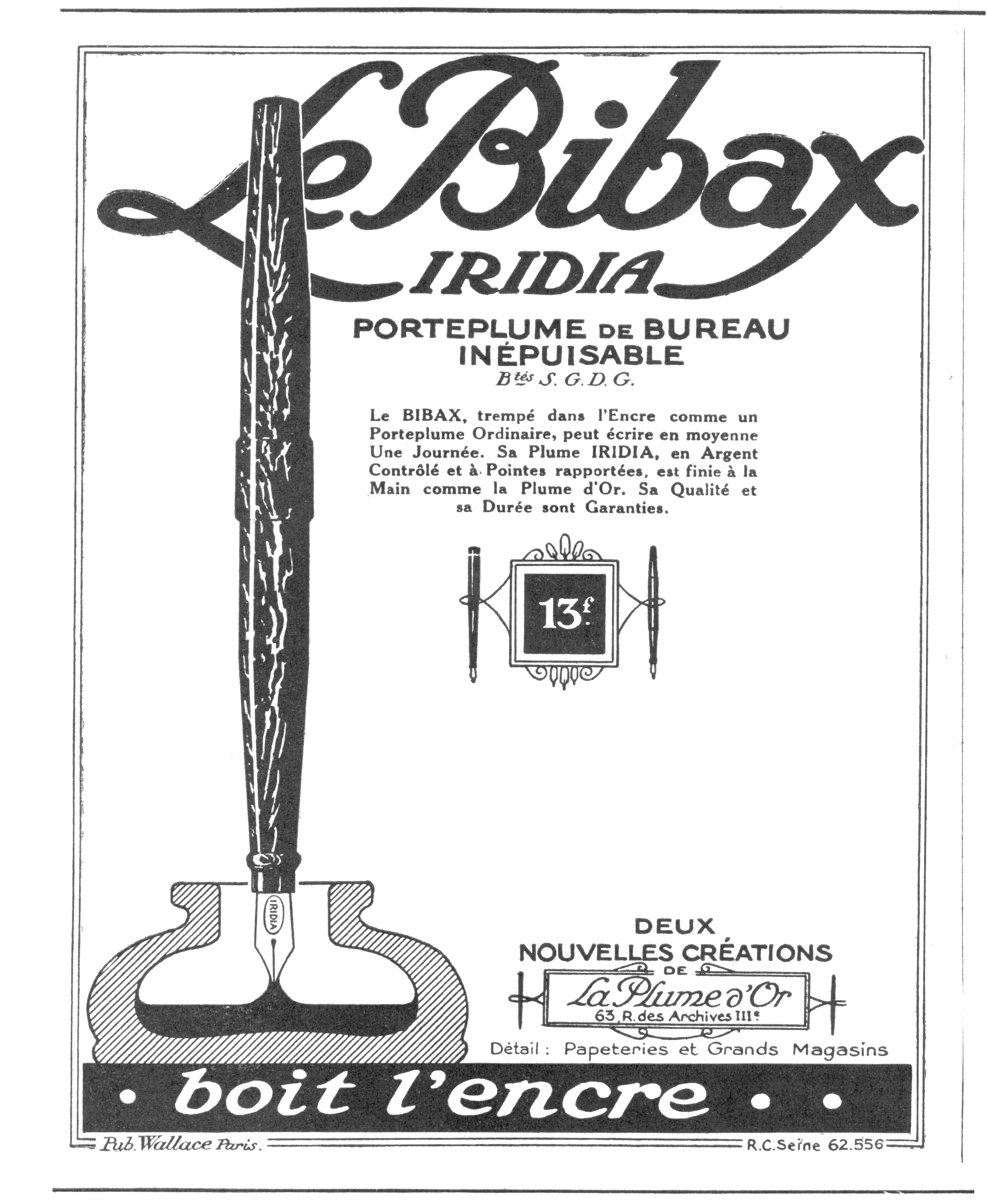 Scansione di una pubblicità Météore datata 1924-03-08. Pubblicazione su: L'Illustration, n. 4216. Riferimento all'azienda come: "La Plume d'Or". Indica come indirizzo: "Rue des Archives 63, Paris IIIe". Ritoccata dall'autore per una migliore nitidezza. Data riportata su una sezione non inclusa nell'immagine. Pubblicità per la penna da scrivania Bibax. Cita il pennino in argento Iridia.