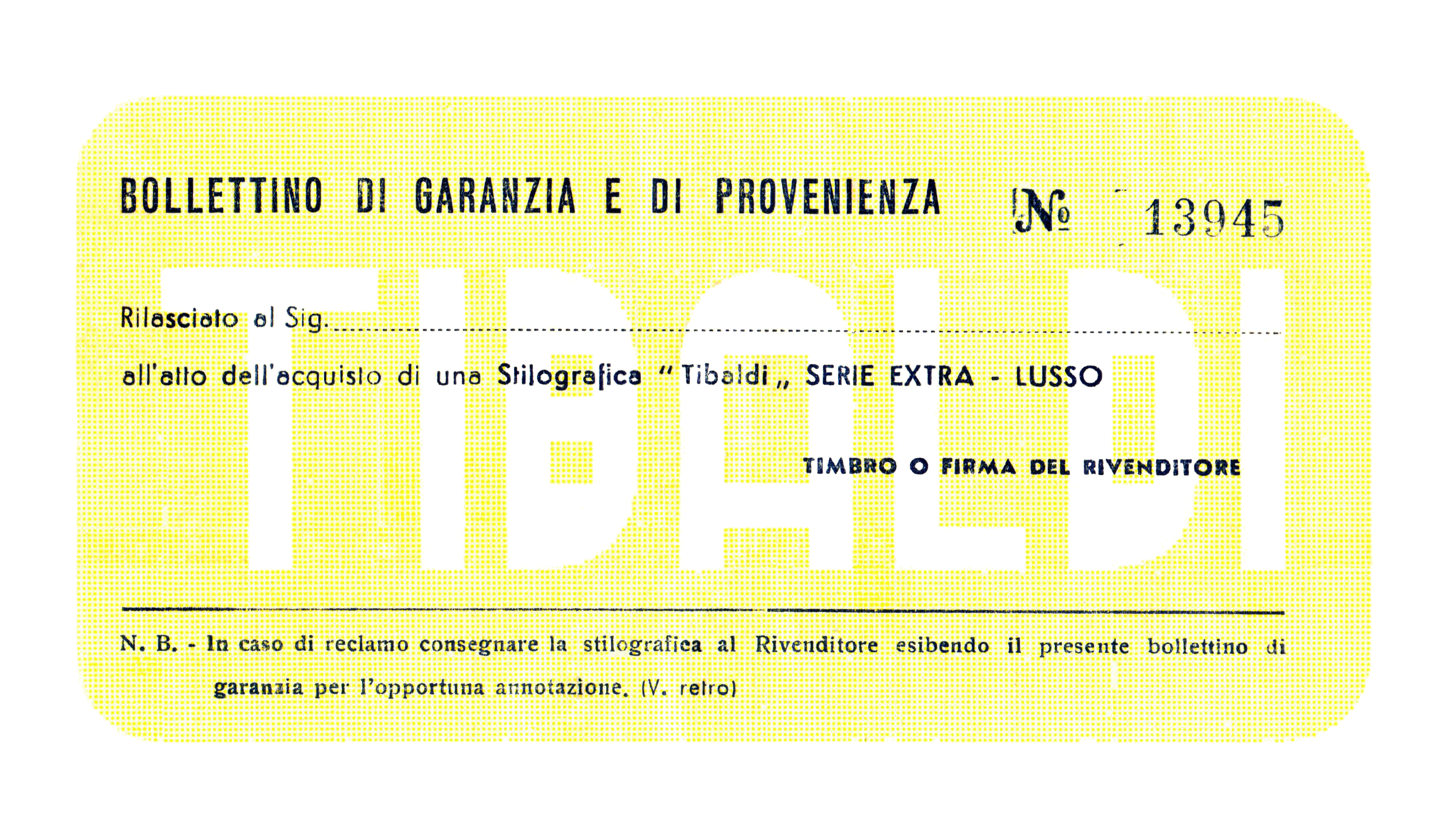 Scanning of a Tibaldi a warranty from '40s. For a Tibaldi Extra Lusso model. Front. Found in a Tibaldi Trasp.M box. On the other side of File:Tibaldi-Extra-Lusso-Warrant-Back.jpg. Retouched by the author for a better sharpness. From an original package.