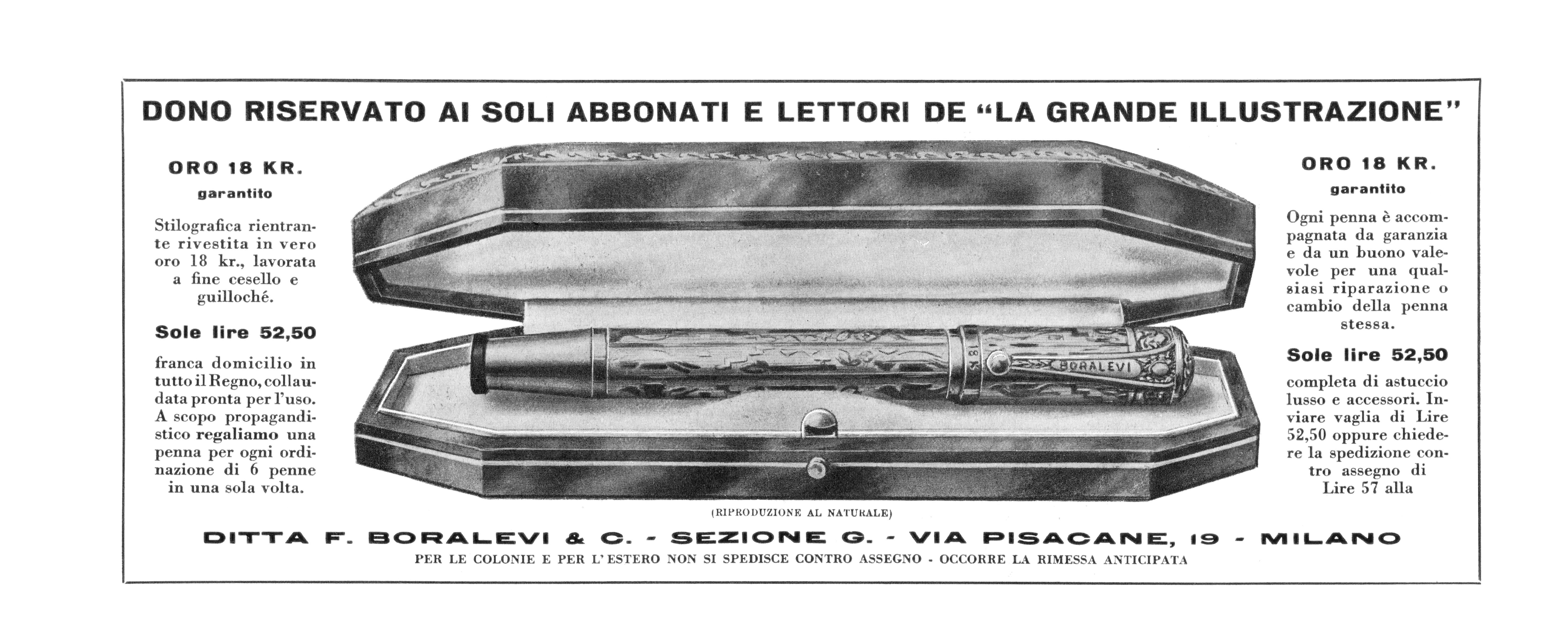 Scansione di una pubblicità Boralevi datata 1930-12. Pubblicazione su: La Grande Illustrazione d'Italia, anno VII, n. 12, pag. 44. Ritoccata dall'autore per una migliore nitidezza. Data visibile direttamente. Pubblicizza un modello rientrante laminato dato come premio ai lettori del giornale. Sull'altro lato di File:1930-12-Wahl-DecoBand.jpg.