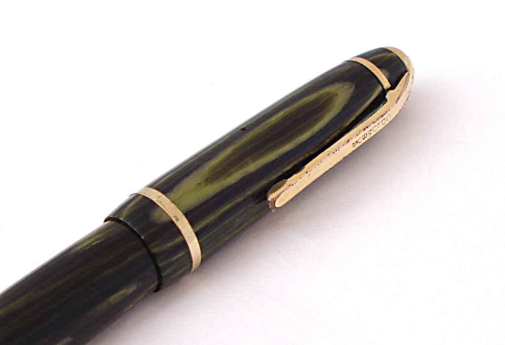 Photo of a pen produced by Columbus. Model: Columbus Extra 132. Filling system: lever filler. In striated green celluloid.