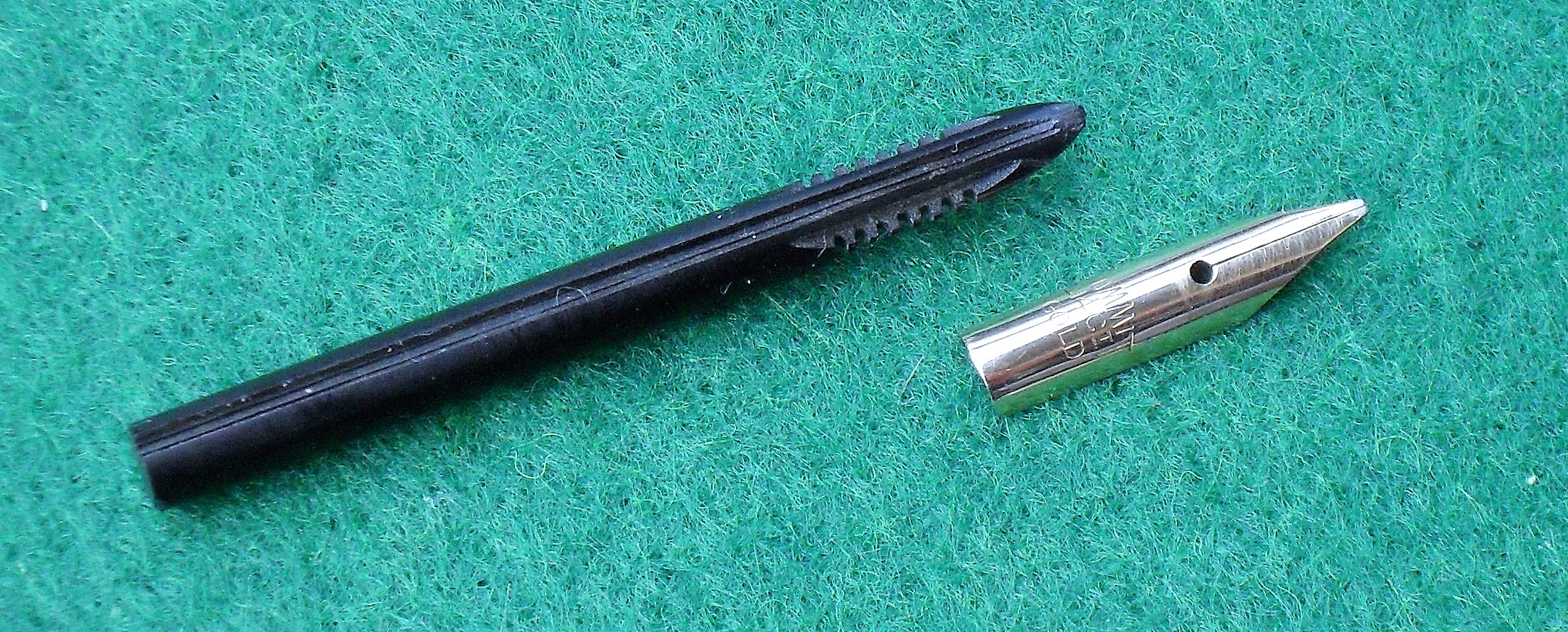 Photo of a pen/pencil set produced by Summit (a Lang - Curzon - Summit trademark). Model: Summit S.170. Filling system: button filler. In smooth gray plastic resin. Detail of feeder. Detail of nib. Model called Crest. Complete of price stickers, box and documents.