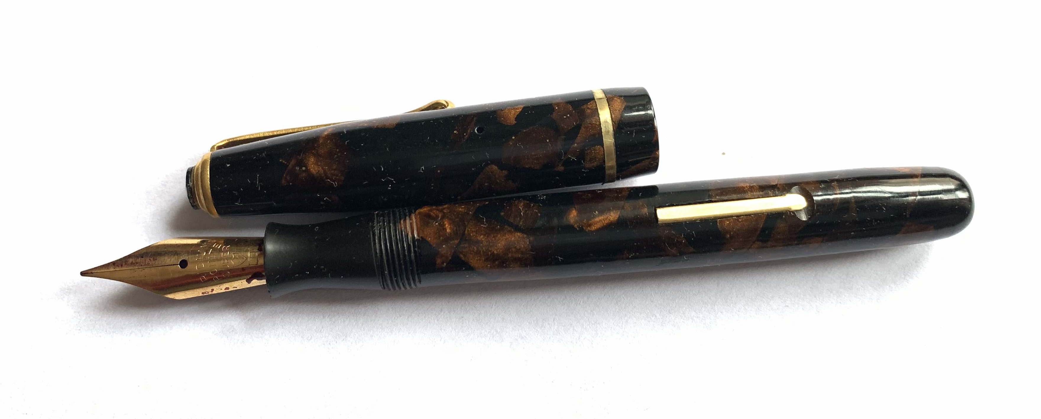 Photo of a pen/pencil set produced by OldChap. Filling system: lever filler. In marbled brown celluloid. Unknown model.