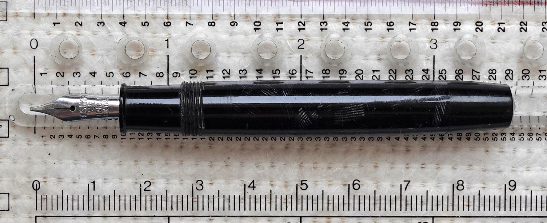 Photo of a pen produced by Wilmas. Model: Wilmetta. Filling system: button filler. In dark blue pine needles celluloid. Small model. Substituted nib.