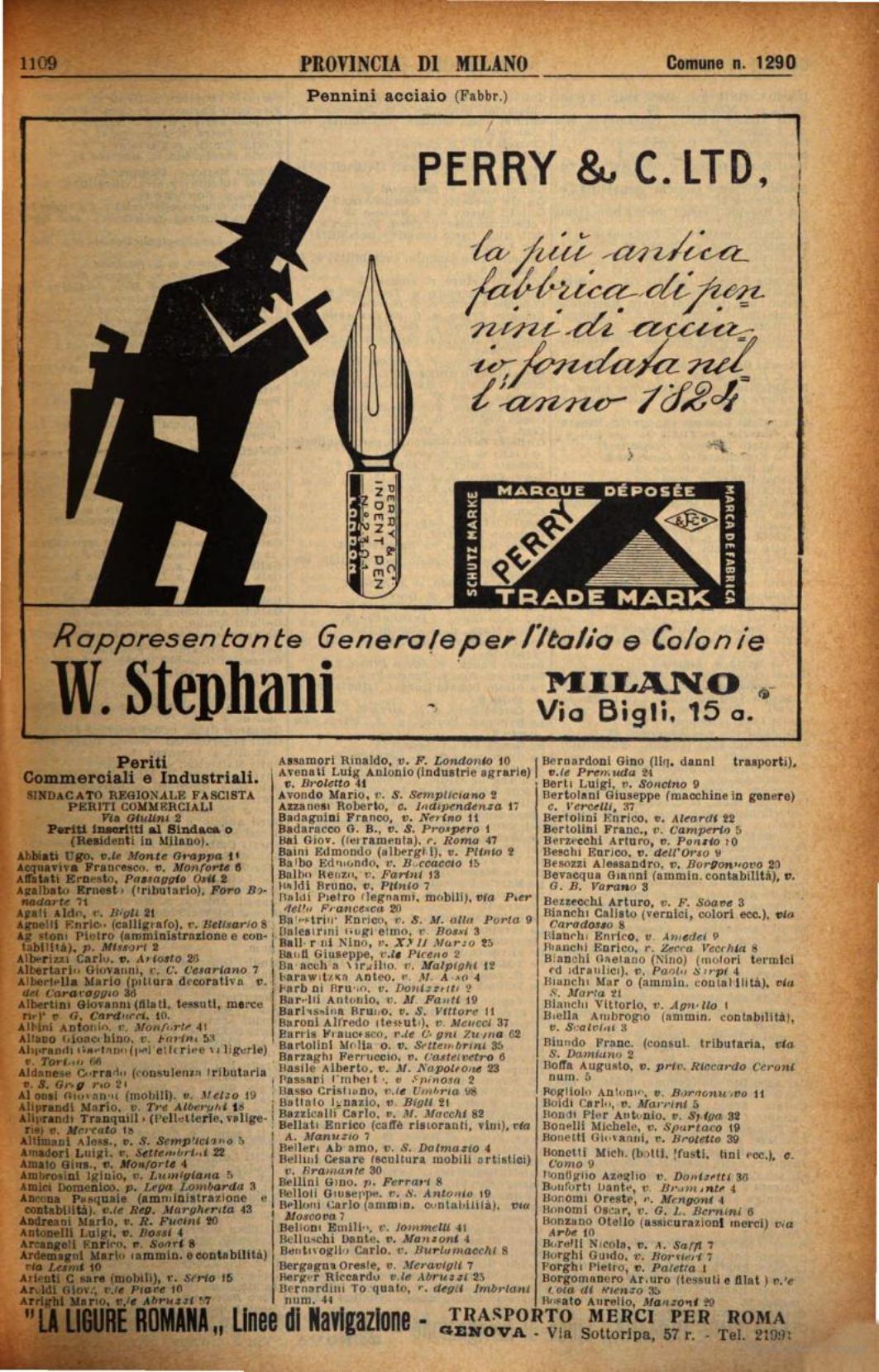 | − | |Note_en=Page for the province of Milan containing entries for steel nibs. It mentions: Stephani W. agent for [[Perry]]. | + | * ''"Stephani W.''", via Bigli 15a, (rappresentante della [[Perry]]). |