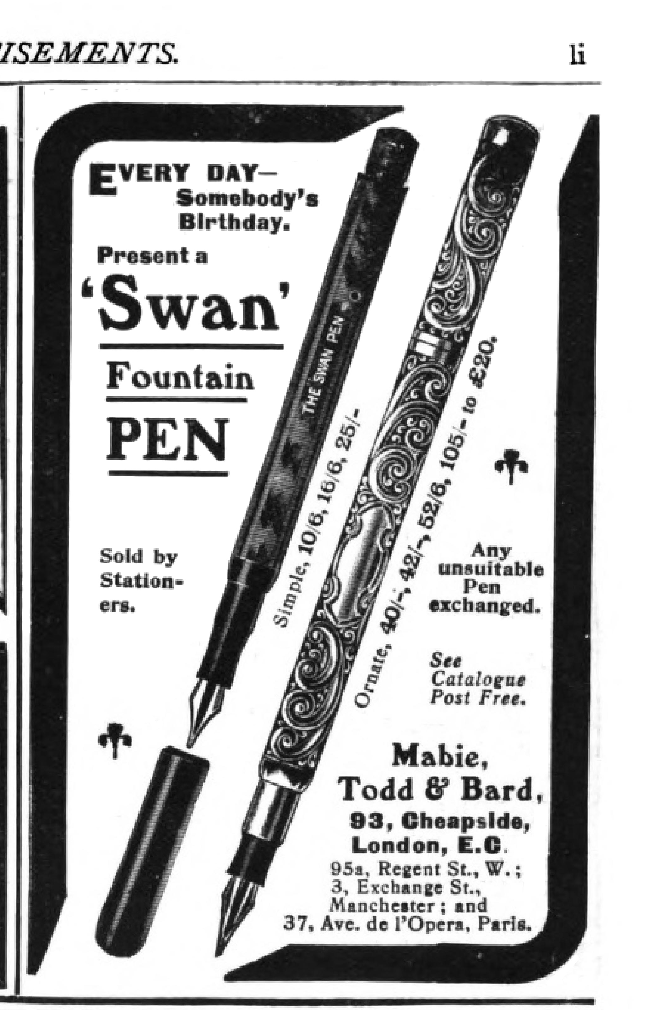 Scansione di una pubblicità Swan datata 1902. Pubblicazione su: The Strand Magazine - An Illustrated Monthly, vol. XXIII (Jan-Jun), pag. li. Riferimento all'azienda come: "Mabie, Todd, & Bard". Indica come indirizzo: "95a, Regent St. W.; 93, Cheapside, London, E.C". Data dal reperimento della pagina su una versione archiviata della rivista. Prima metà dell'anno. Pubblicità per una stilografica Swan Fountain Pen, indica le semplici prezzate 10/6, 16/6 e 25/- e le decorate 40/-, 42/-, 52/6, 104/- to £20.