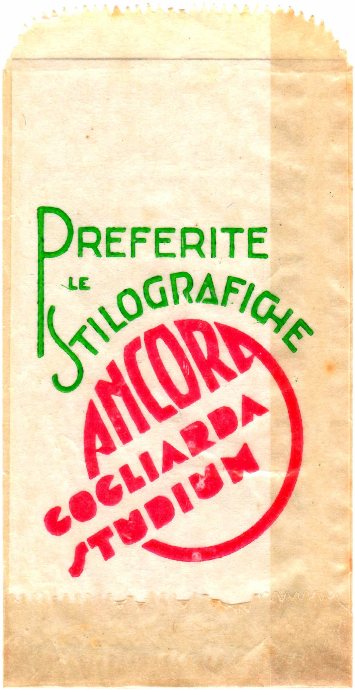 Scansione di una busta Ancora datata 1932. Data indicativa, dai nomi citati. Pubblicizza le sottomarca Goliarda ed il modello Studium. Sull'altro lato di File:193x-Ancora-Bustina-DuplexGoliardaStudium-Front.jpg.