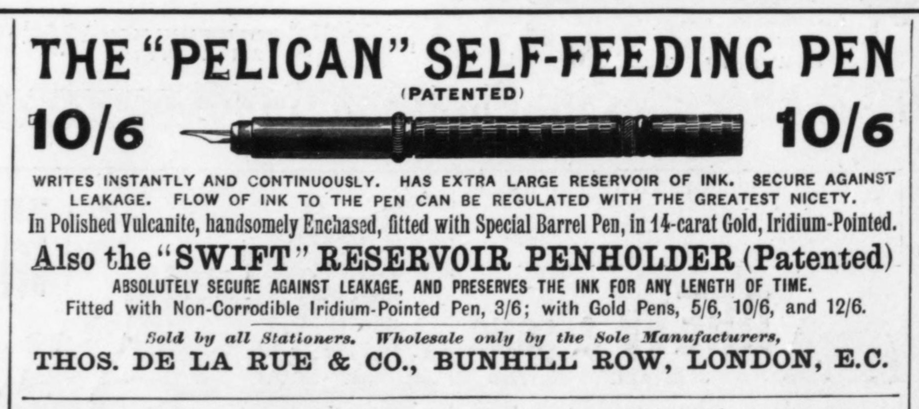 Scanning of advertising from Onoto dated 1896-04-18. Published on: The Illustrated London News, vol. CV, n. 2974, pag. 512. Refers to the company as: "Thos. De La Rue and Co.". Mention as address: "Bunhill Row, London, E.C.". Dating established by finding the page in an archived version of the magazine. Published also on: vol. CIX, n. 2995 (1896-09-12), p. 352; vol. CIX, n. 3003 (1896-11-07), p. 613; vol. CIX, n. 3006, (1896-11-28), p. 741; vol. CX, n. 3012, (1897-01-09), p. 67; vol. CX, n. 3029, (1897-05-08), p. 658. Advertising for the "Pelican Self-Feeding Pen" and the "Swift Reservoir Penholder".