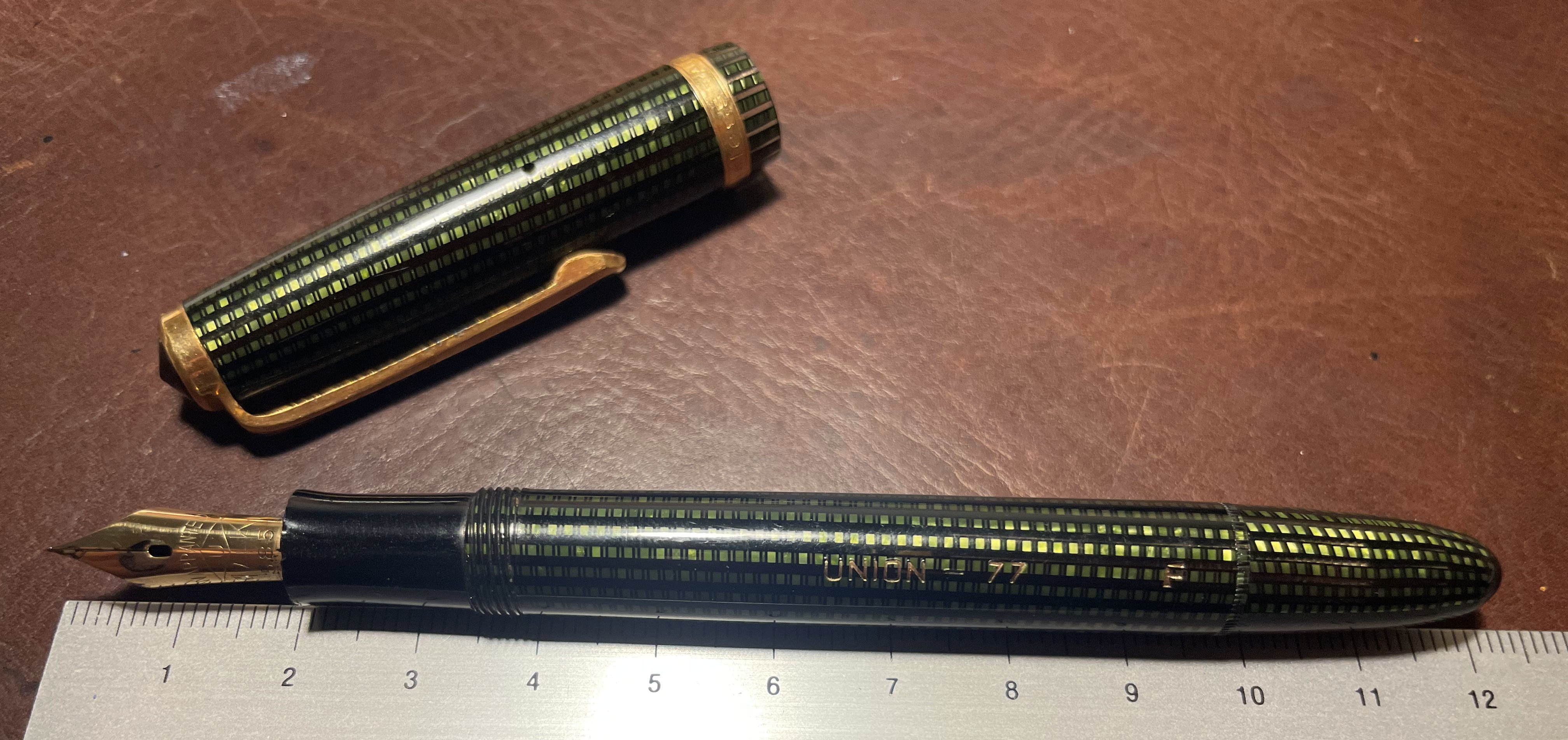 (== Dettagli == {{PhotoInfo |Marca=Union Vulpenhouderfabriek |Modello=Airless 77 |Oggetto=pen |Caricamento=piston |Contributo=Jaconib |Materiale=celluloide |MatDesc_it=a righe quadrettate verdi |MatDesc_en=green squared lines |Note_it=Modello marcato ''Union - 77'' sul fusto, e ''Airless'' sull'anello del cappuccio. |Note_en=Model marked ''Union - 77'' on barrel, with ''Airless'' imprint on cap ring. }}) |
