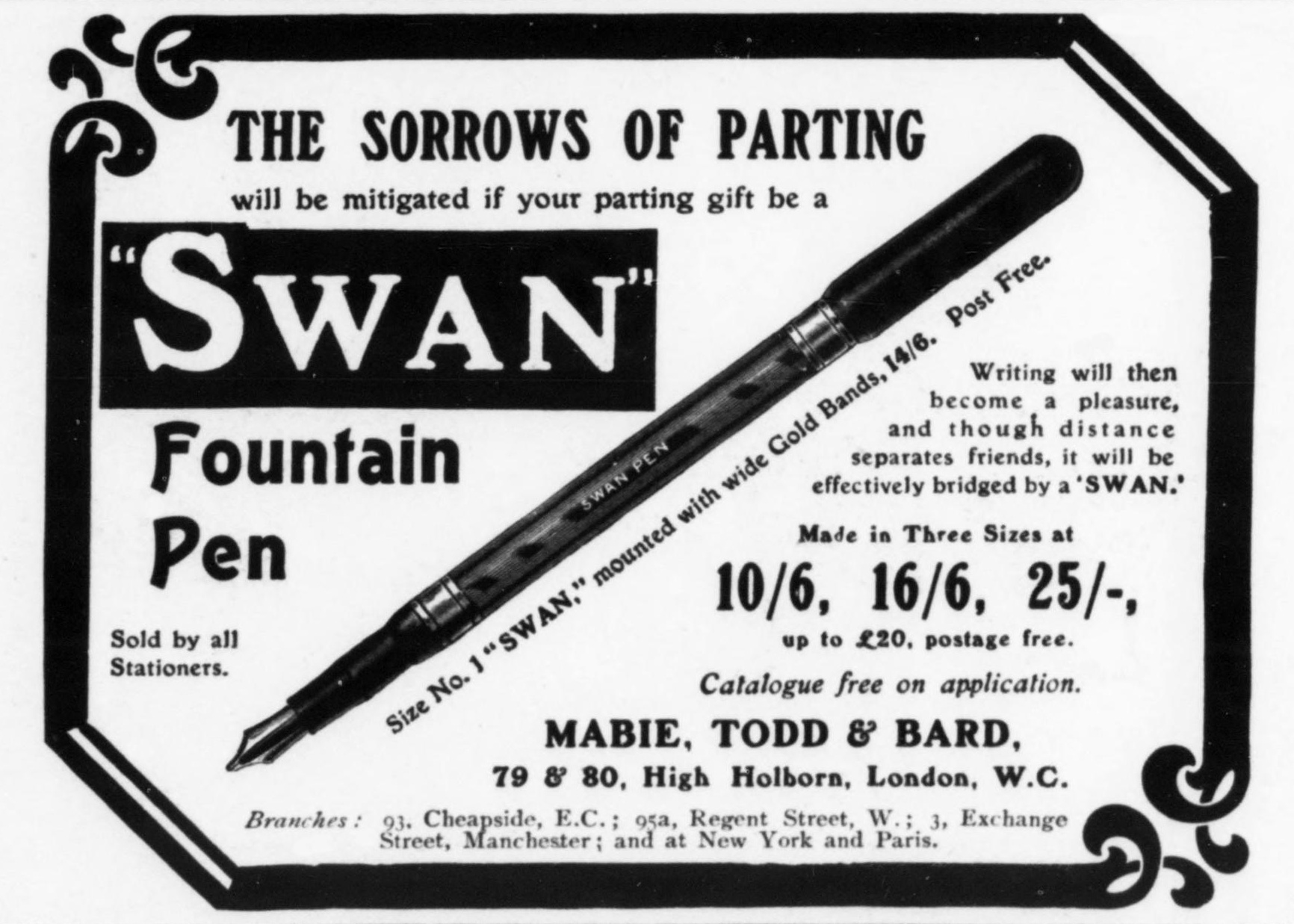 Scansione di una pubblicità Swan datata 1905-02-25. Pubblicazione su: The Illustrated London News, vol. CXXVI, n. 3436, pag. 286. Riferimento all'azienda come: "Mabie, Todd, & Bard". Indica come indirizzo: "79 & 80, High Holborn, London, W.C.". Data dal reperimento della pagina su una versione archiviata della rivista. Pubblicata anche su: vol. CXXVI, n. 3440, (1905-03-25), p. 433; vol. CXXVI, n. 3444, (1905-04-22), p. 597; vol. CXXVI, n. 3448, (1905-05-20), p. 733; vol. CXXVI, n. 3452, (1905-05-17), p. 864; vol. CXXVIII, n. 3482, (1906-01-13), p. 68; vol. CXXVIII, n. 3486, (1906-02-10), p. 215; vol. CXXVIII, n. 3490, (1906-03-10), p. 366; vol. CXXVIII, n. 3494, (1906-04-07), p. 512; vol. CXXVIII, n. 3498, (1906-05-05), p. 658; vol. CXXVIII, n. 3502, (1906-06-02), p. 817; vol. CXXVIII, n. 3504, (1906-06-16), p. 911; vol. CXXVIII, n. 3506, (1906-06-30), p. 989; vol. CXXIX, n. 3510, (1906-07-27), p. 145. Pubblicizza una stilografica Swan Pen, cita tre dimensioni prezzate rispettivamente 10/6, 16/6 e 25/- fino a £20.