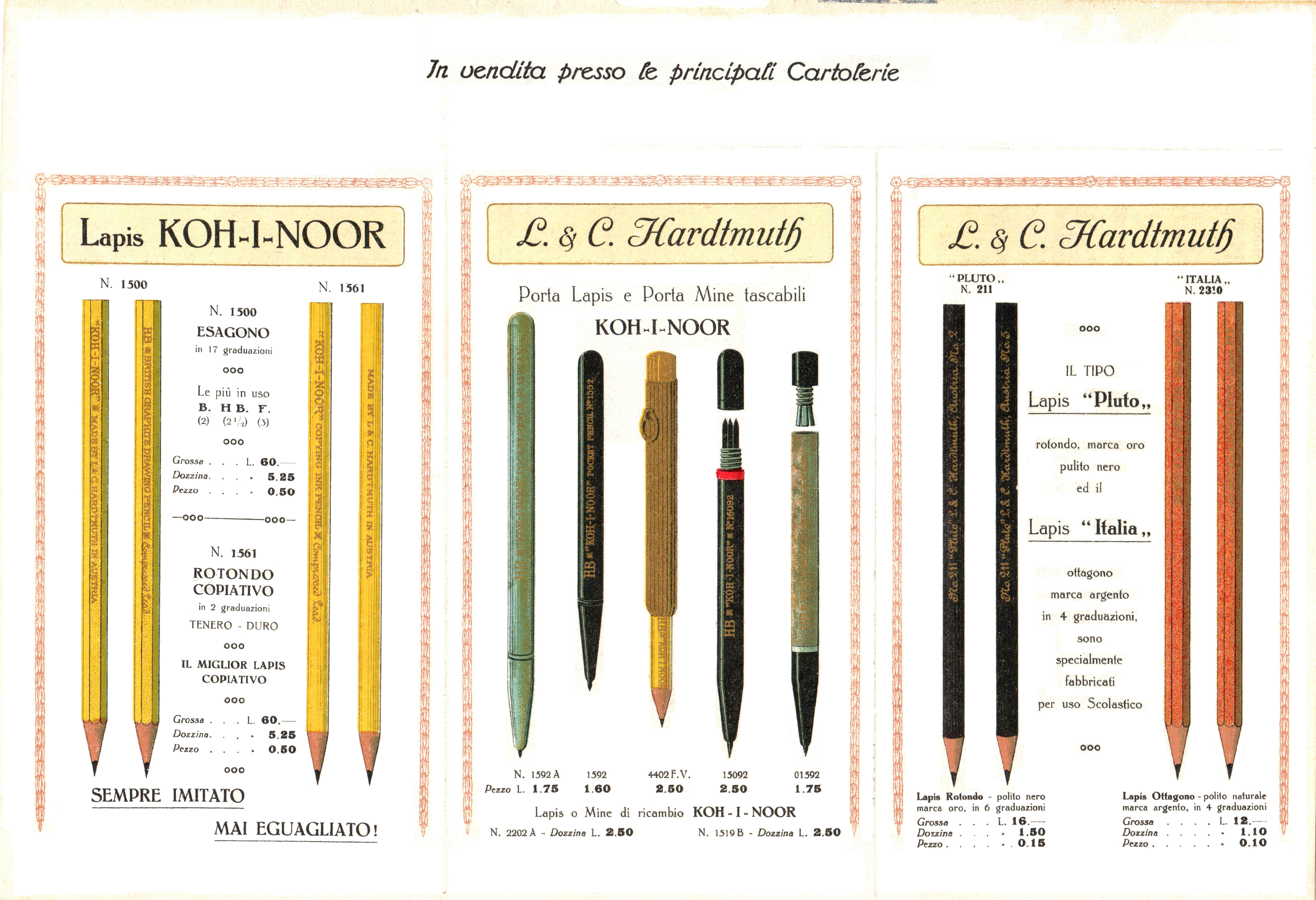 Scanning of a brochure from Hardtmuth dated 1912. Retouched by the author for a better sharpness. Guess date, from similar one made for Waterman. Advertisement for a series of office pencils from the Hardtmuth featuring the Koh-i-Noor pencil.