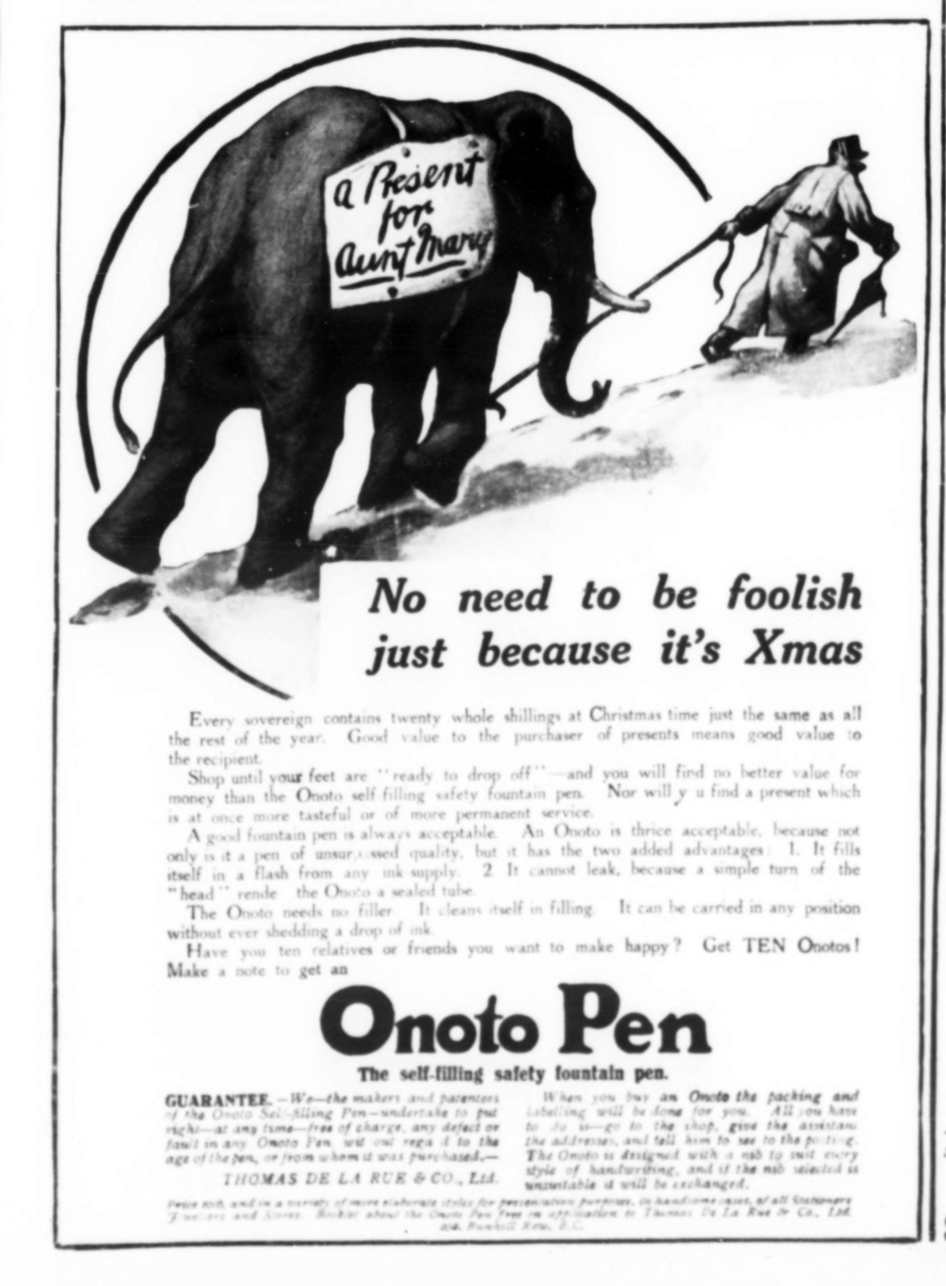 (== Dettagli == {{AdsInfo |Marca=Onoto |Data=1913-12-13 |Paese=UK |Giornale=The Illustrated London News |Volume=CXLIII |Numero=3895 |Pagina=1025 |Source=https://archive.org/details/sim_illustrated-london-news_1913-12-13_143_3895/page/1025/mode/1up |Creatore=Internet Archive: https://archive.org/details/internetarchivebooks |Licenza=PD-exp |Nome=Thomas De La Rue & Co. |Tema=natale,strenne |Note_it=Pubblicizza le prime stilografiche a marchio [[Onoto]...) |