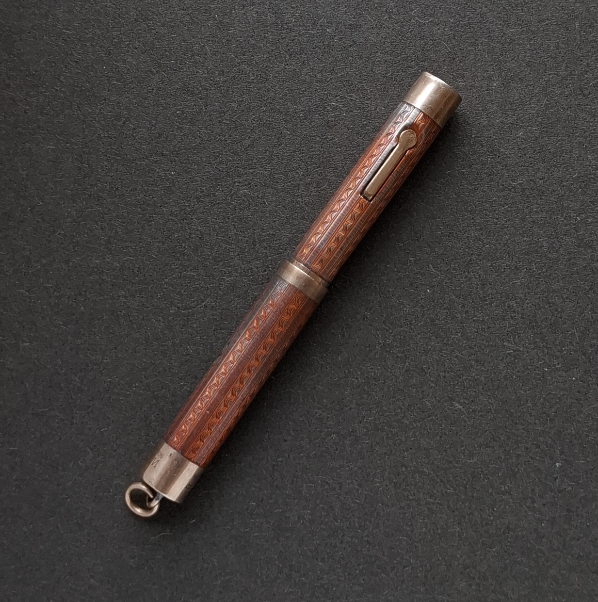 Foto di una penna Eversharp. Modello: Wahl Metal Pen. Caricamento a levetta. Realizzazione in vermeil con lavorazione guilloché a smalto rosso. Misura piccola, da signora, nella lavorazione Tinted, versione smaltata in rosso, codice X3218R. Contributo di Giorgio (utente forum Musicus).