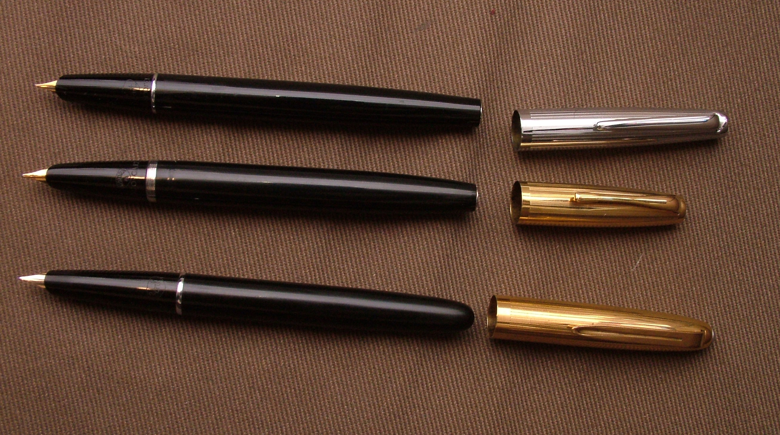Foto di una serie di stilografiche Aurora. Modello: Duo-Cart. Caricamento a cartuccia. Realizzazione in resina plastica nera. Tre versioni, dall'alto verso il basso: 2cart con cappuccio lungo, Duo-Cart con cappuccio corto, 2cart-K. Contributo di Massimo (utente forum maxpop55).
